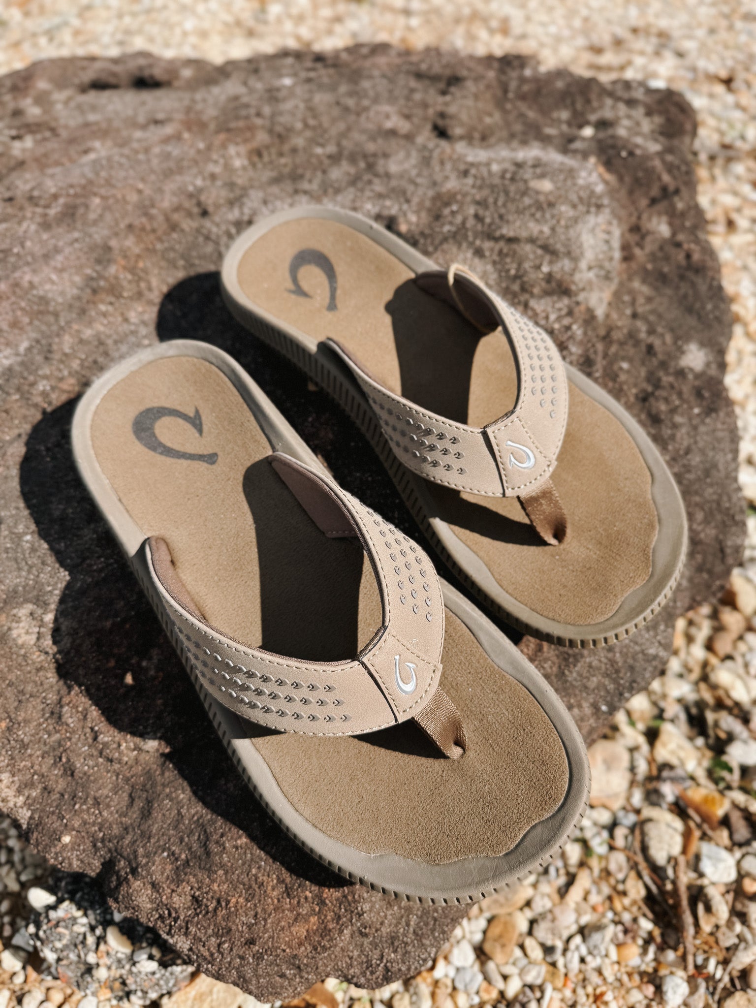 OluKai Craftsmanship: Features Kalo plant-inspired laser-cut upper straps and an embroidered hook logo.