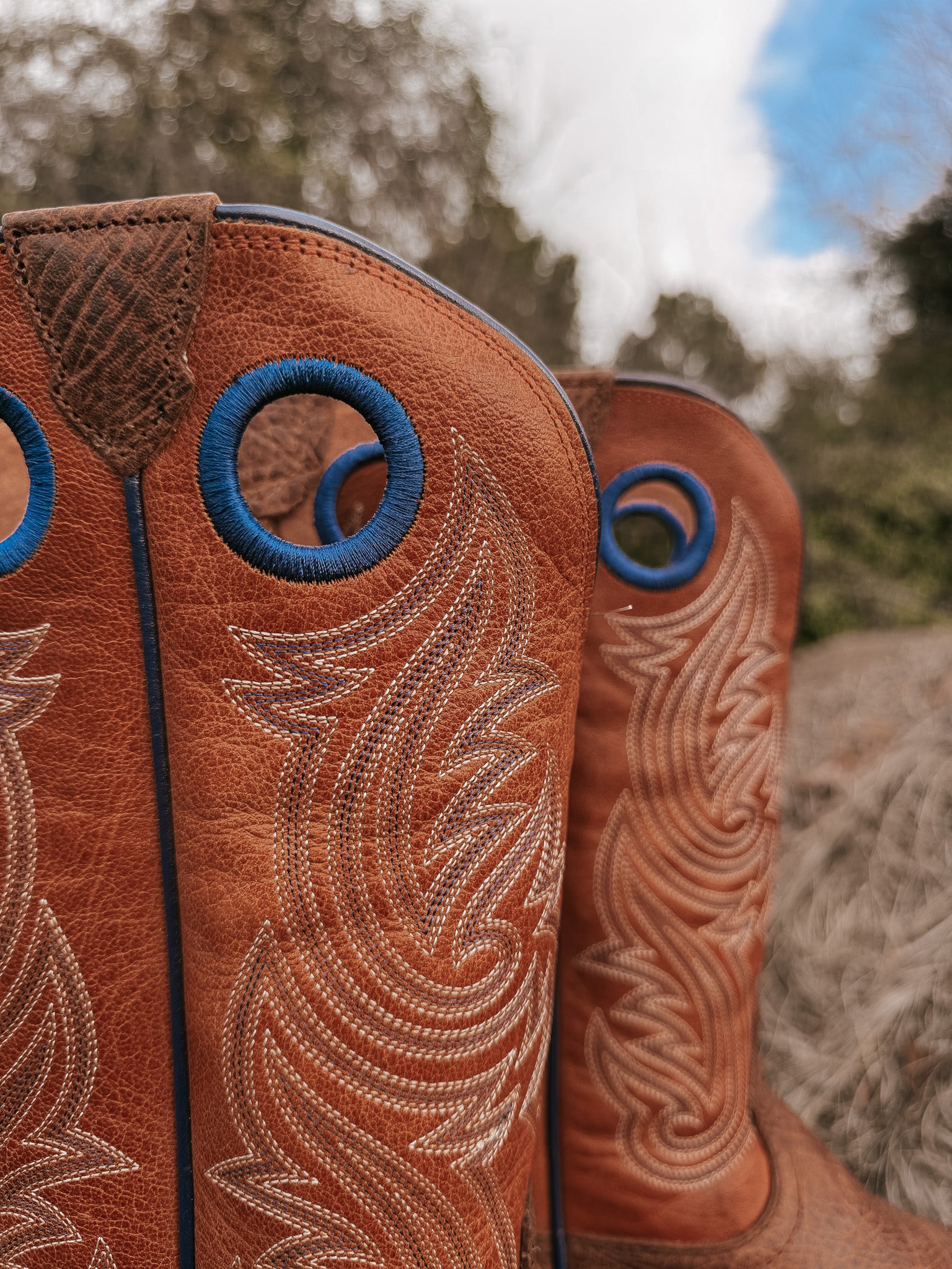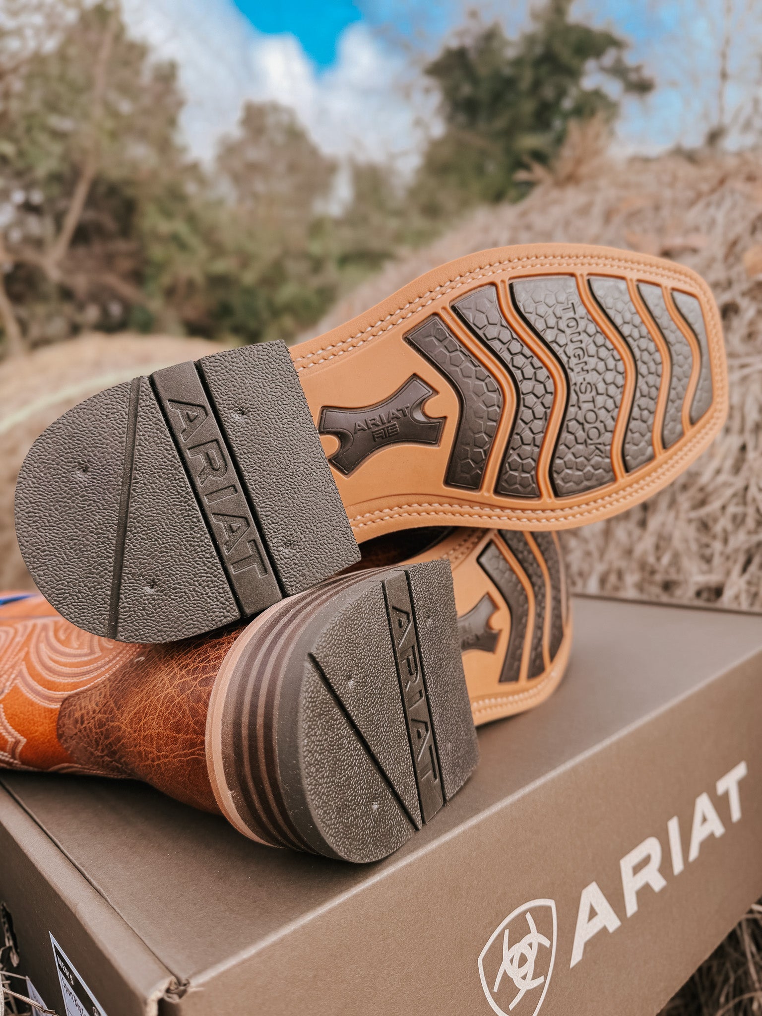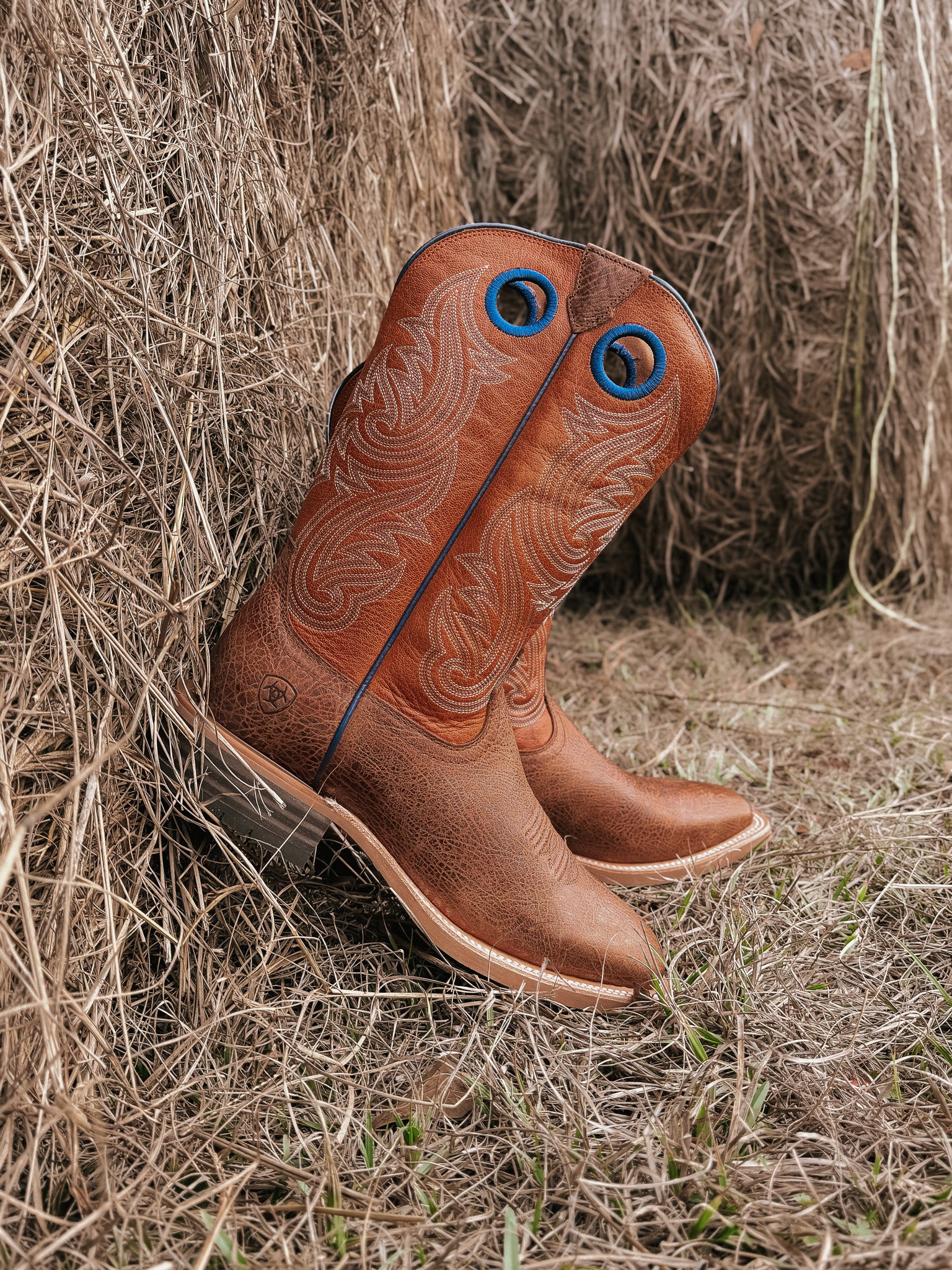 The Ariat Men's Highland Toughstock Performance Western Boot is a durable, wide square-toe boot featuring ATS technology for support, a leather upper, and a slip-resistant rubber outsole, designed for work and riding with a classic brown, stitched western look.