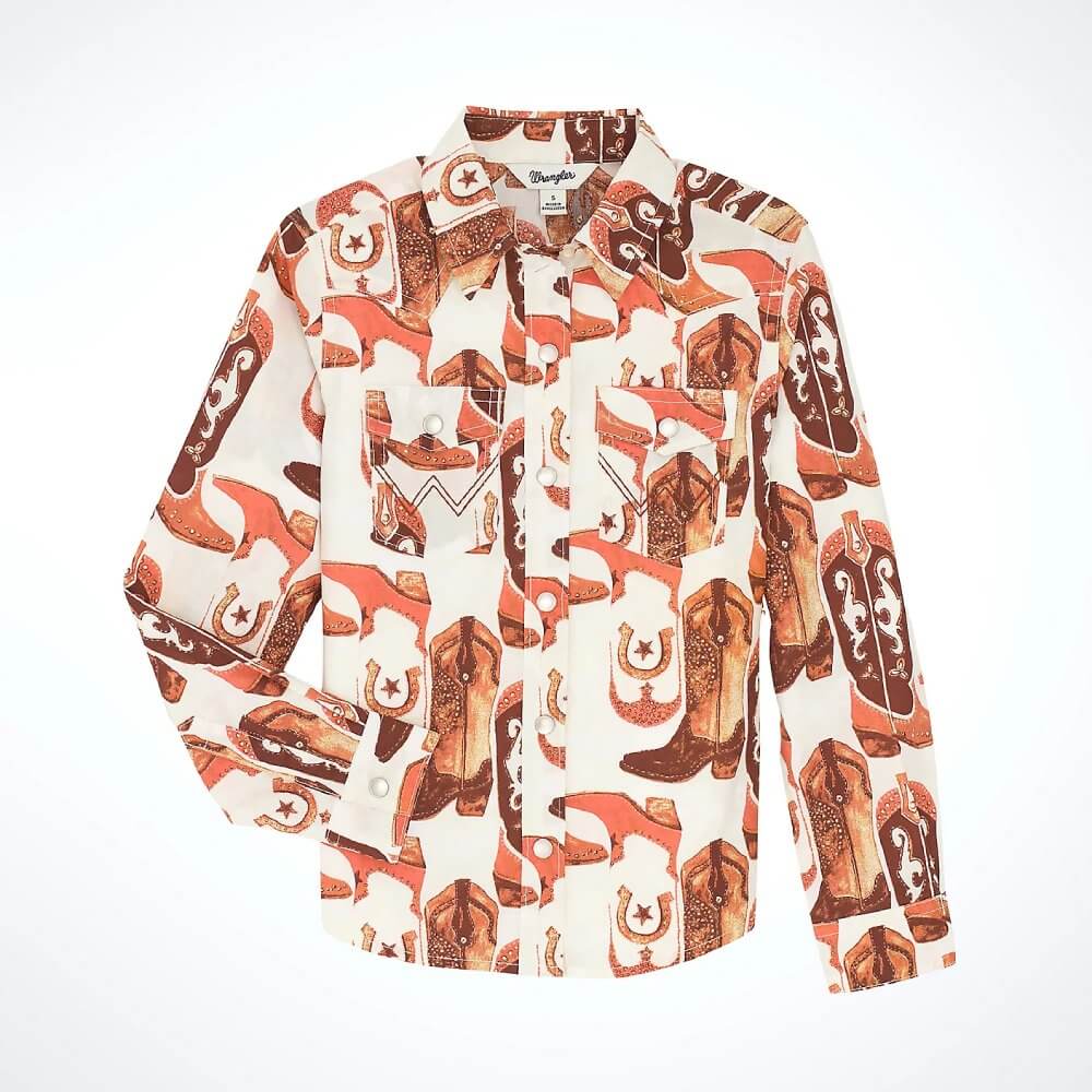 Cool Wrangler Girls Bold Print Western Shirt Pink Boots. An iconic silhouette gets a small-scale update. A fan favorite, Wrangler’s iconic Western snap shirts are a style staple in cowgirl closets across the country. This mini-me version is a style every aspiring cowgirl should have in her arsenal. Designed with the same authentic look of Wrangler’s originals, this girls' Western snap shirt features Western yokes, pearl snap buttons, and two flap snap chest pockets with 'W' embroidery. Its bold color scheme put fashion first while the easy-to-layer silhouette makes for versatile, year-round styling.
