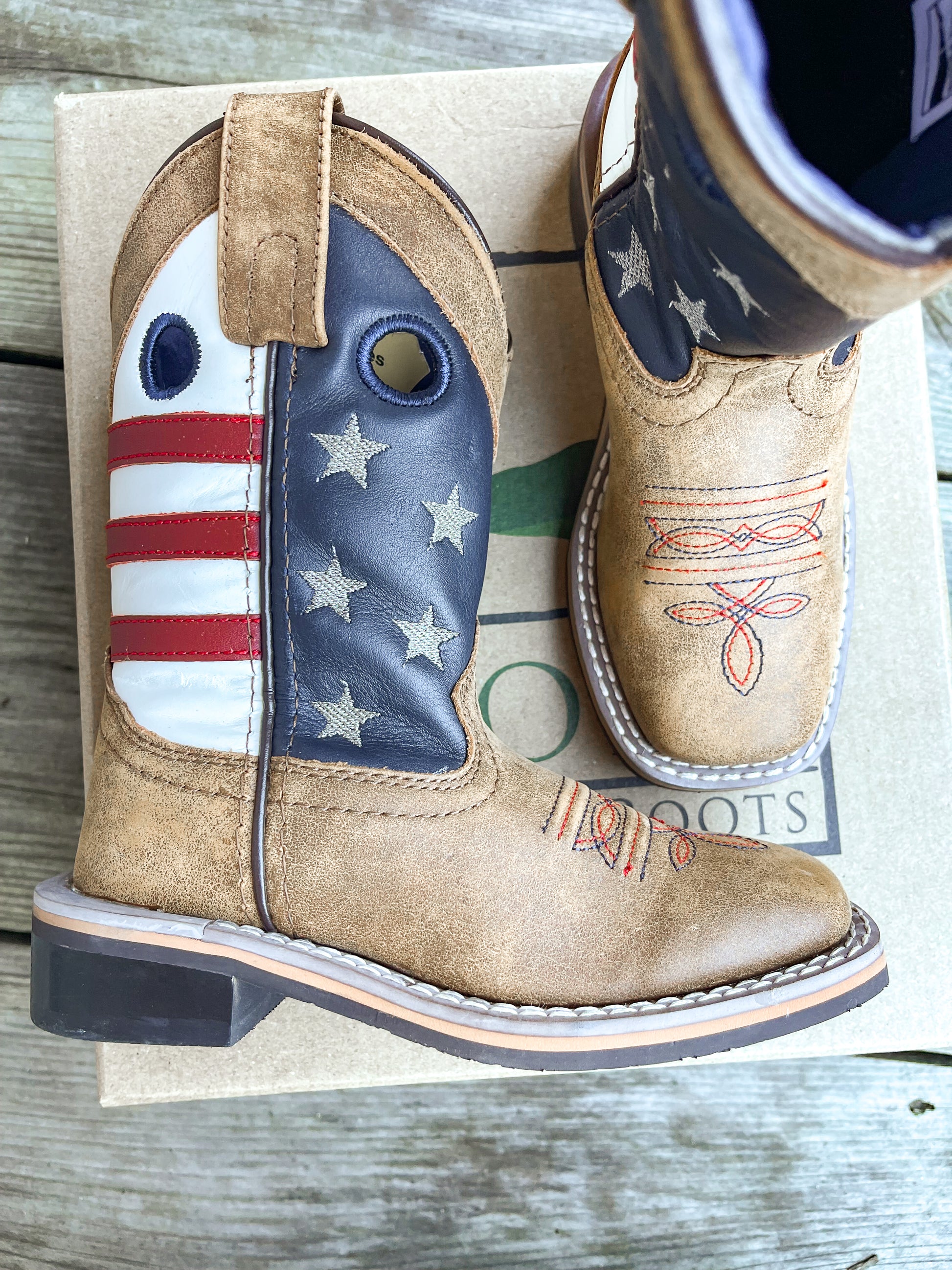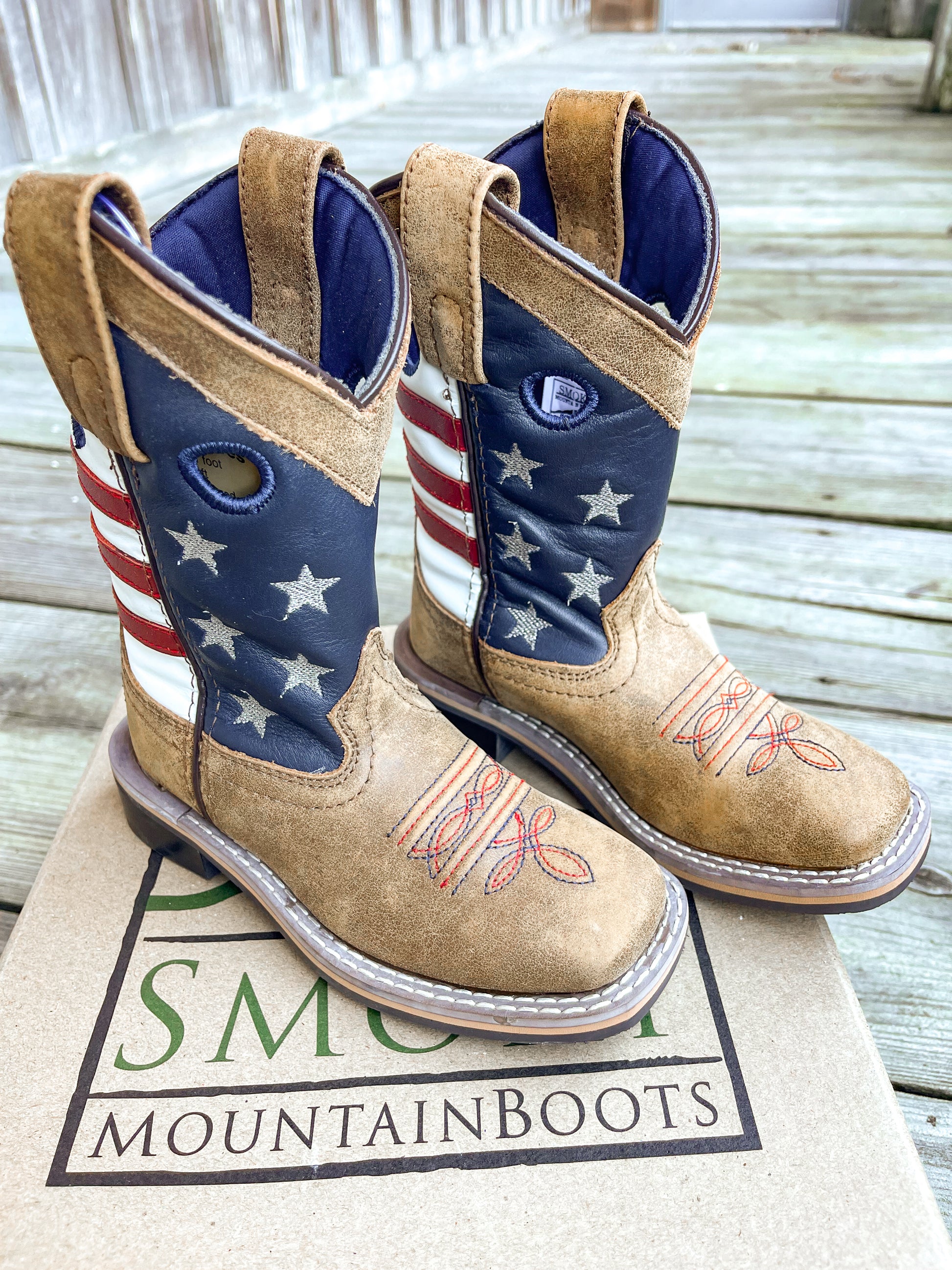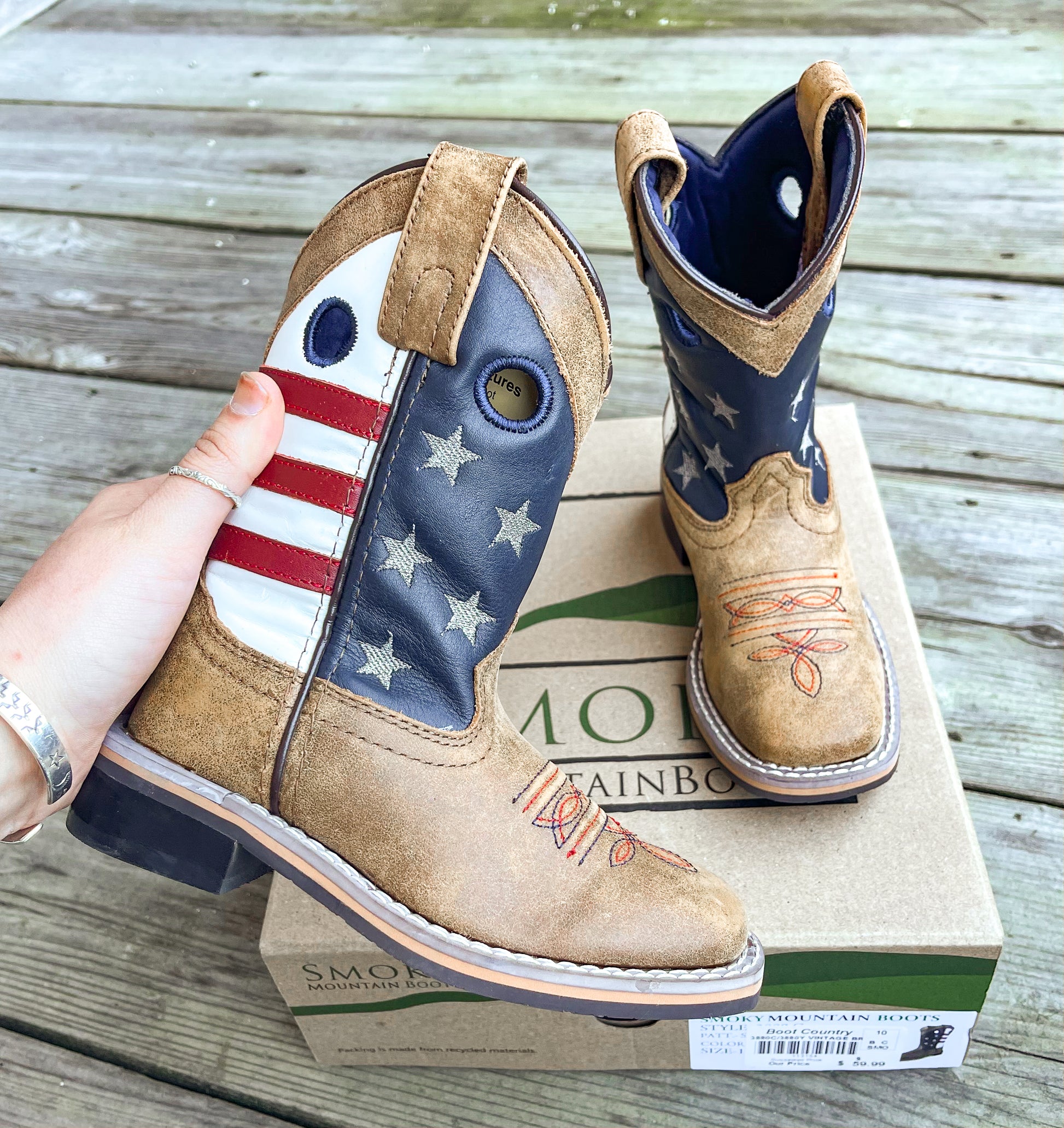 La bota Smoky Mountain Stars and Stripes es justo lo que tu pequeño patriota necesita. Esta bota clásica con un toque patriótico presenta una parte superior de rayas y estrellas, puntera cuadrada y suela de goma.