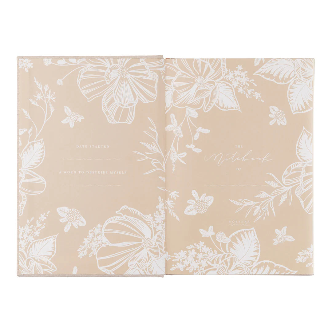 This beautiful notebook features Hosanna Revival's Casablanca design. Inspired by the town of Casablanca, Morocco, this notebook has a gorgeous, lacey, embroidered floral design, reminiscent of the rich heritage of this town’s textile port. Outlines of delicate, white embroidered magnolias cover this notebook, giving it an elegant and elevated look, while gold-gilded pages give this notebook an extra touch of beauty. The back of this beautiful notebook features a gold-foiled verse, Psalm 51:10, “Create in me a clean heart.” This verse serves as a reminder that when we commune with God, we should desire to be refined by his love and grace. We pray that this notebook will carry beautiful prayers, notes, messages, and letters that draw you closer to his deep love for you.