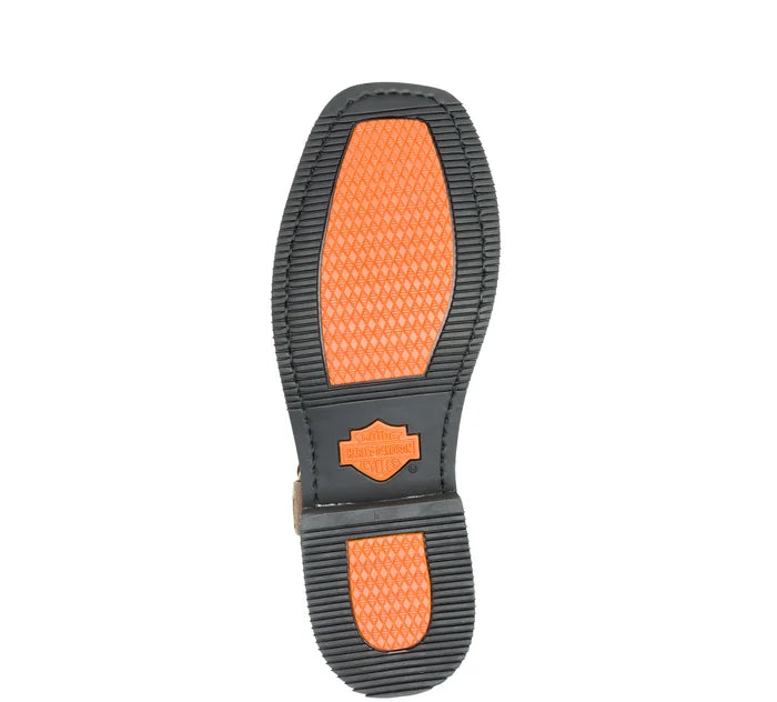 The men’s Hustin West pull on wellington with a unique textured leather, square toe, harness detail and a tonal old English Harley-Davidson® embossed logo for a distinct western flare.