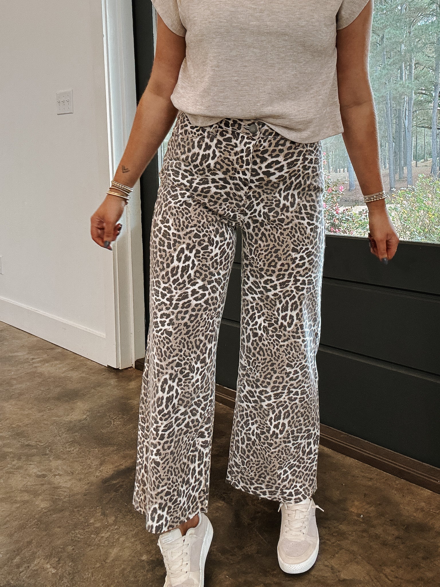 Step into effortless style with these washed animal print twill pants that blend comfort with edge. Featuring a relaxed, stretchy fit and a flattering wide-leg silhouette, they're designed for all-day wear. The raw-cut hem adds a modern touch, while dual front and back pockets keep you practical. Secured with a button and zip fly, these mocha beauties are your new go-to for casual confidence.