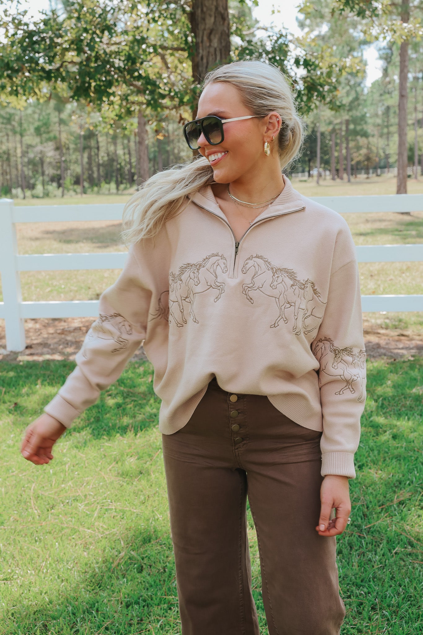 This taupe sweater top features a cozy long sleeve design with a high collar and playful horse embroidery. Made from soft fabric with a relaxed fit, it offers a comfy, non-stretch feel. Finished with a front zipper, it’s perfect for anyone who loves a stylish yet laid-back look.