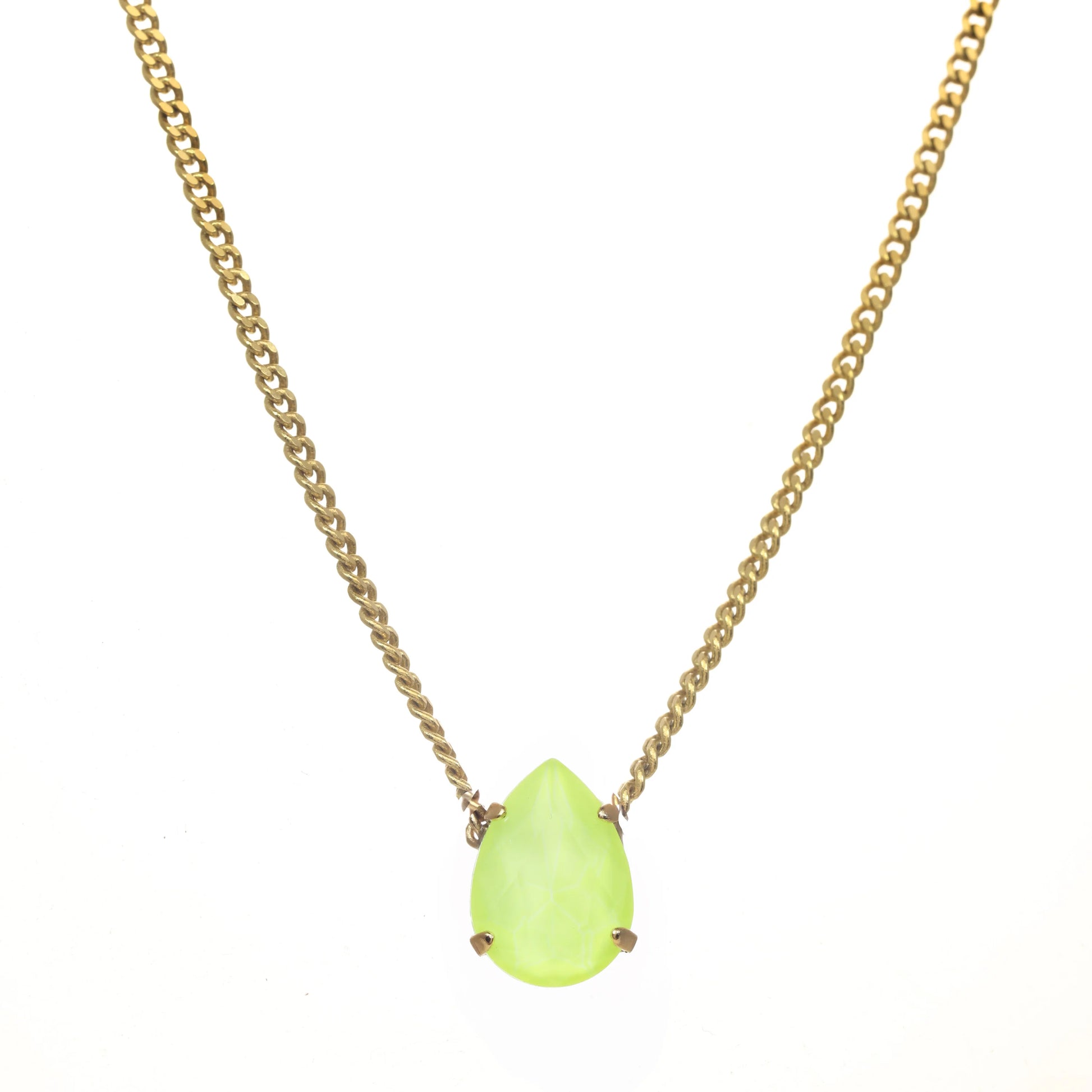 Introducing the Lumi necklace, a dazzling and versatile piece adorned with a high quality pear-shaped stone in the middle. This antique gold-plated necklace features a 14” length with a 3” extension. Handcrafted in Canada.