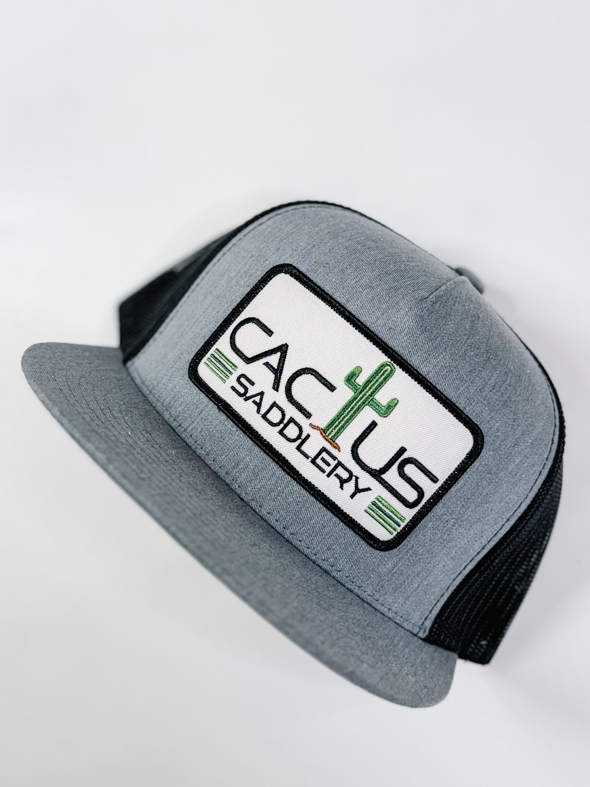 Heather Grey and black Classic 5 panel style snapback cap featuring the new “Cactus Saddlery” patch.