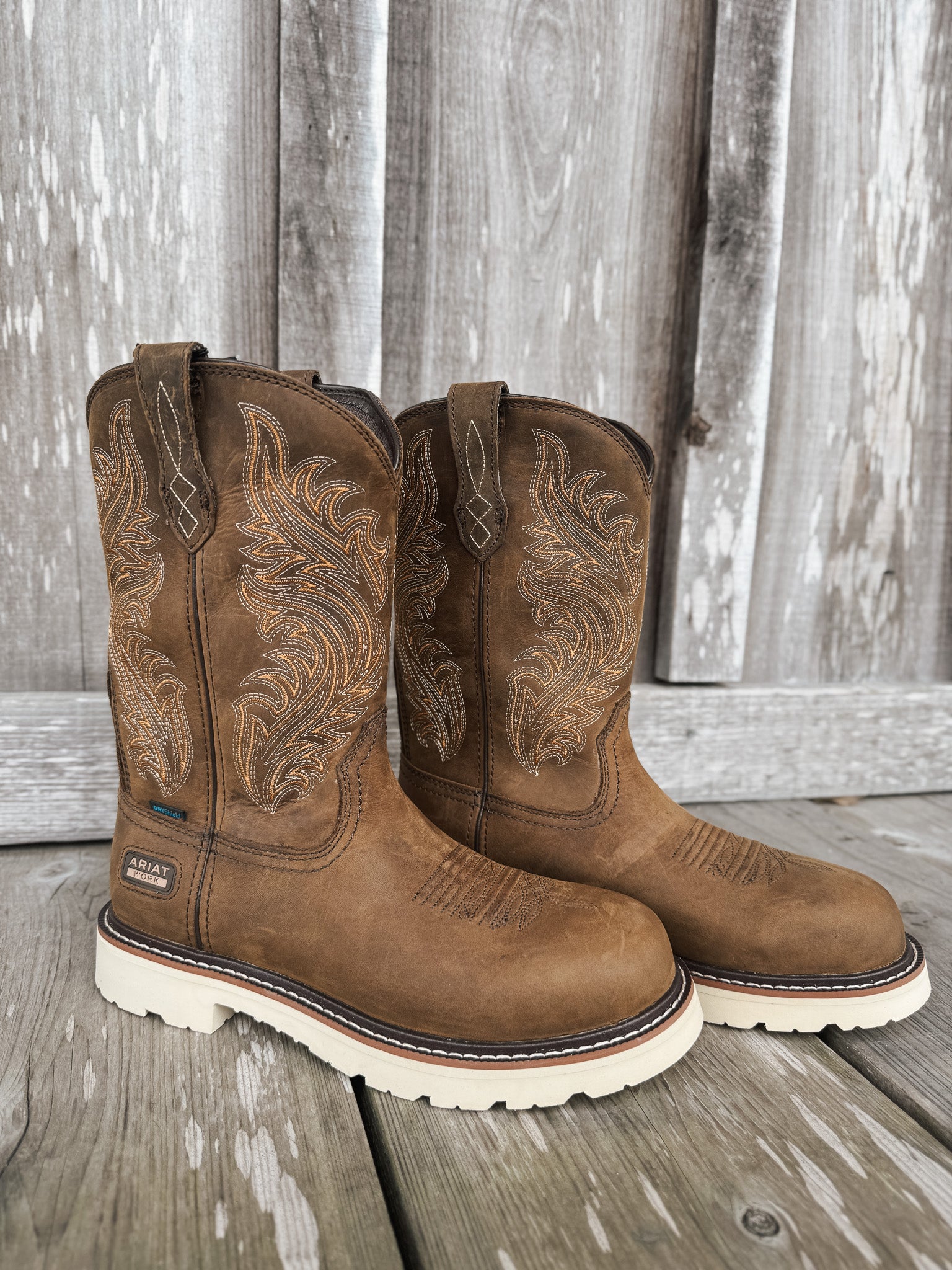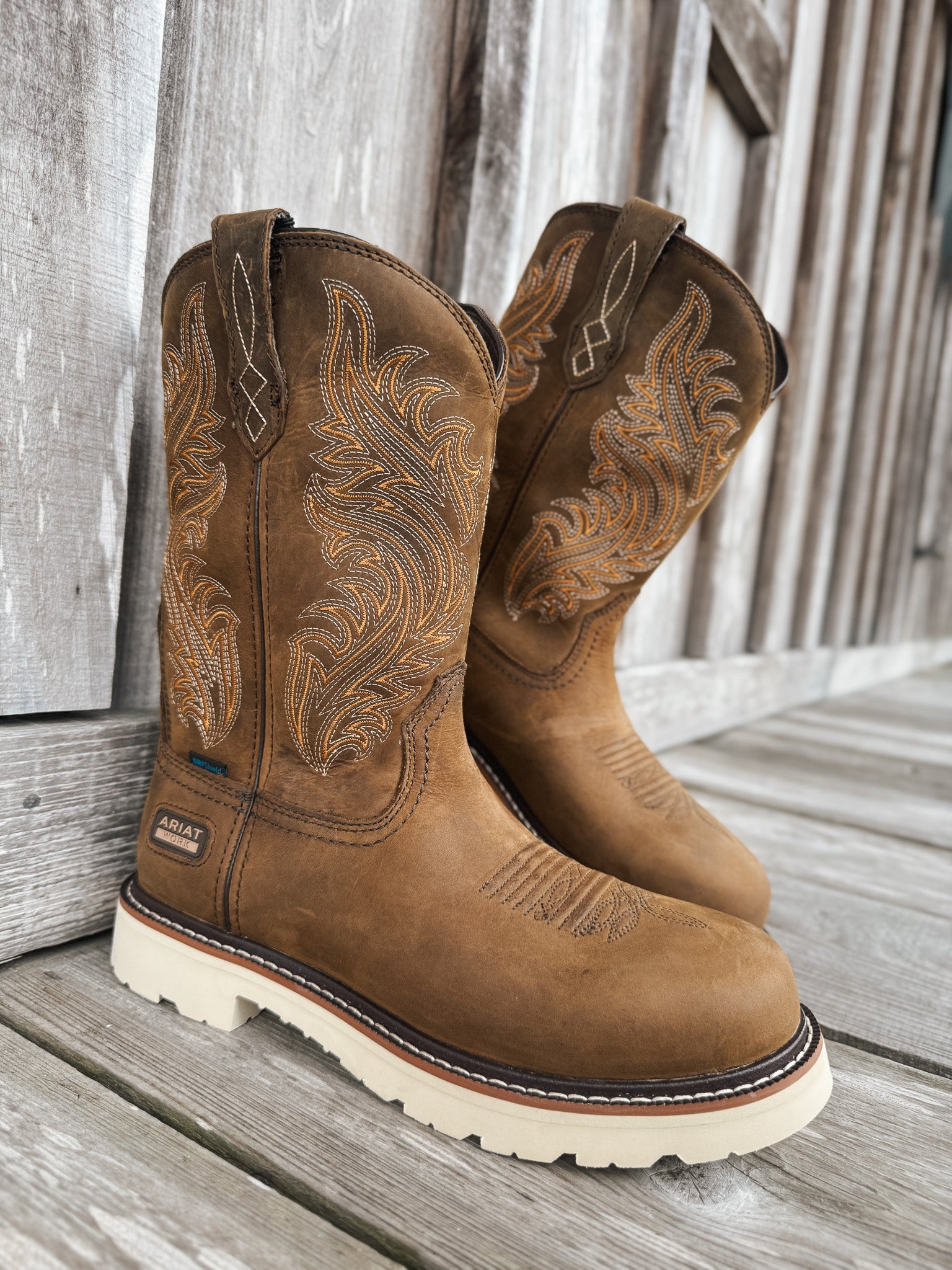 Designed for demanding work environments, the Ariat Men's Activator Argo Waterproof Work Boot features ATS® technology for superior ergonomic support on uneven terrain. Its DRYShield™ waterproof and breathable construction keeps feet dry and comfortable in all conditions. The U-Turn® Entry System provides easy on-and-off access, especially for those with high arches. The round toe and distressed brown finish combine durability with a classic aesthetic, making this boot a reliable choice for professionals seeking both comfort and resilience.