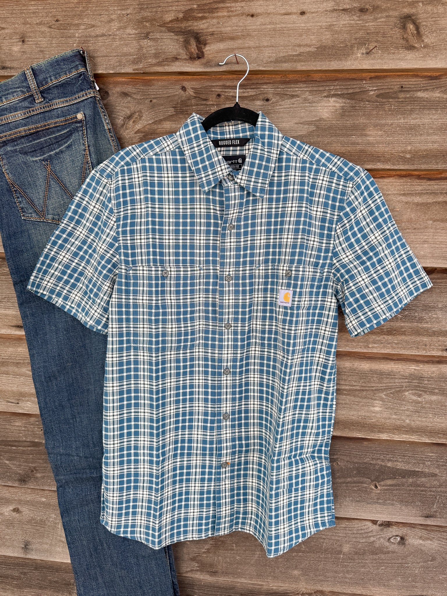 - Carhartt label on left chest pocket