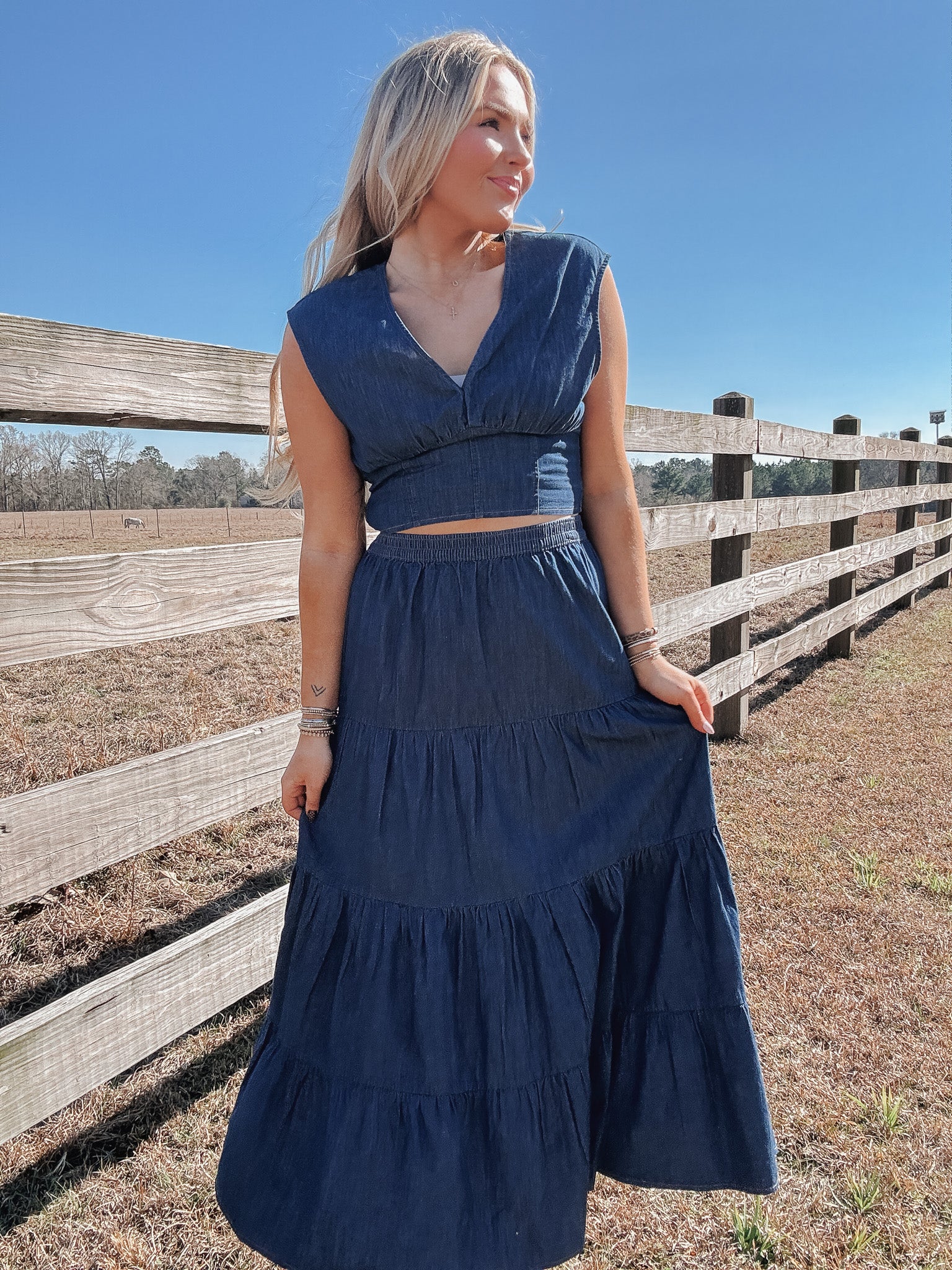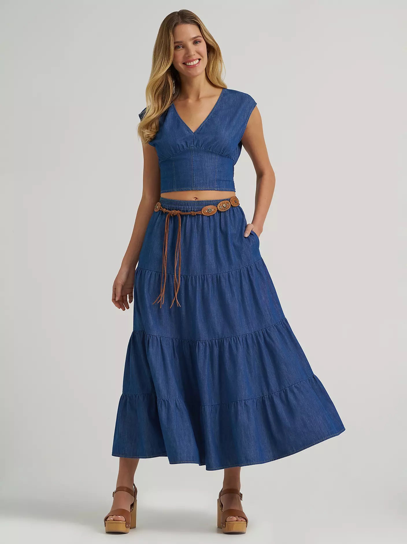 Step into the spotlight with the Wrangler Retro® Smocked Crop Denim Blouse. Romantic down to the smallest detail, it features a flattering fit with a corset-inspired bodice that defines your shape, along with a deep V neckline perfect for accessorizing and elegant cap sleeves for a polished finish. Its cropped silhouette pairs effortlessly with anything high-waisted.