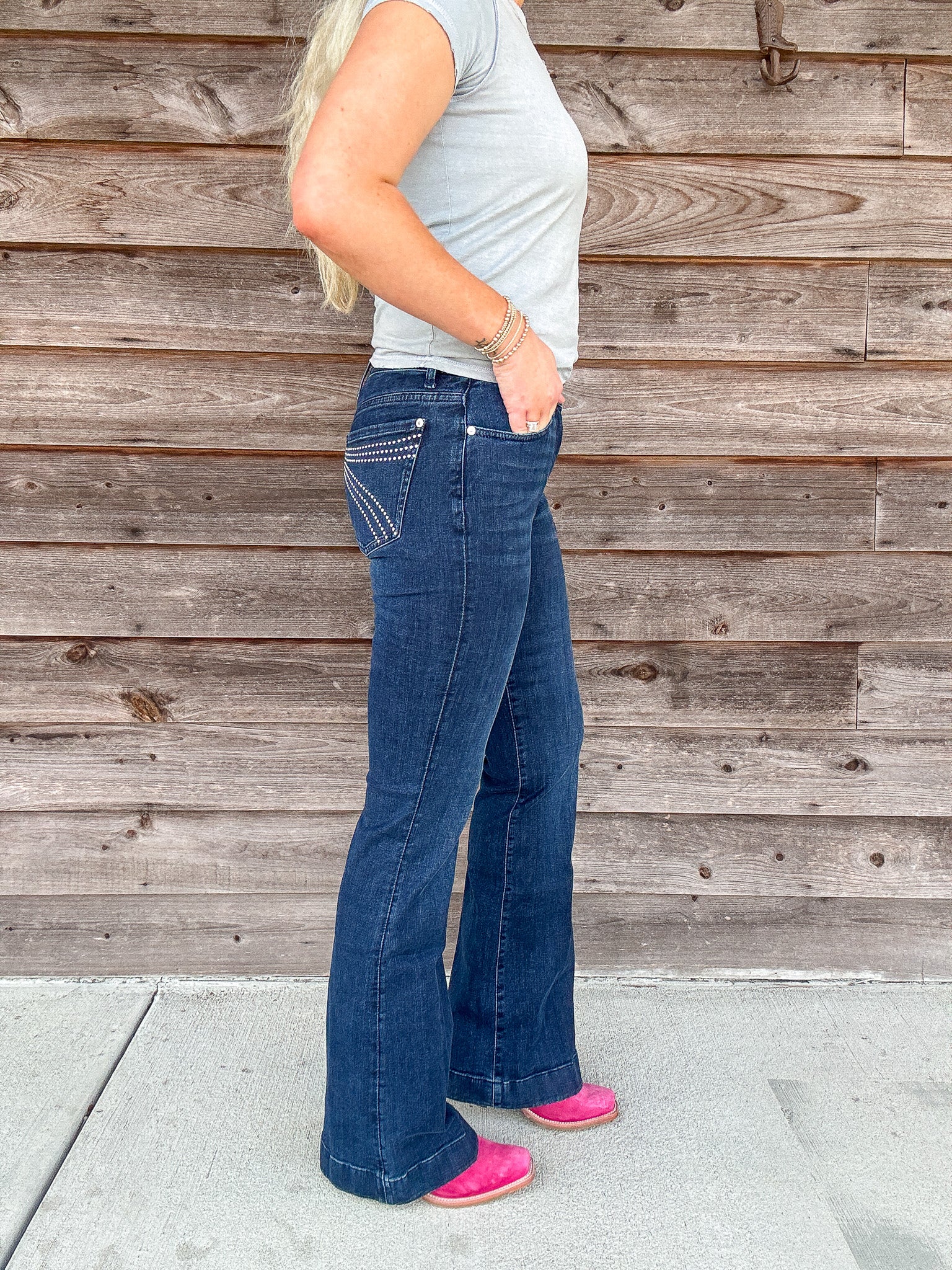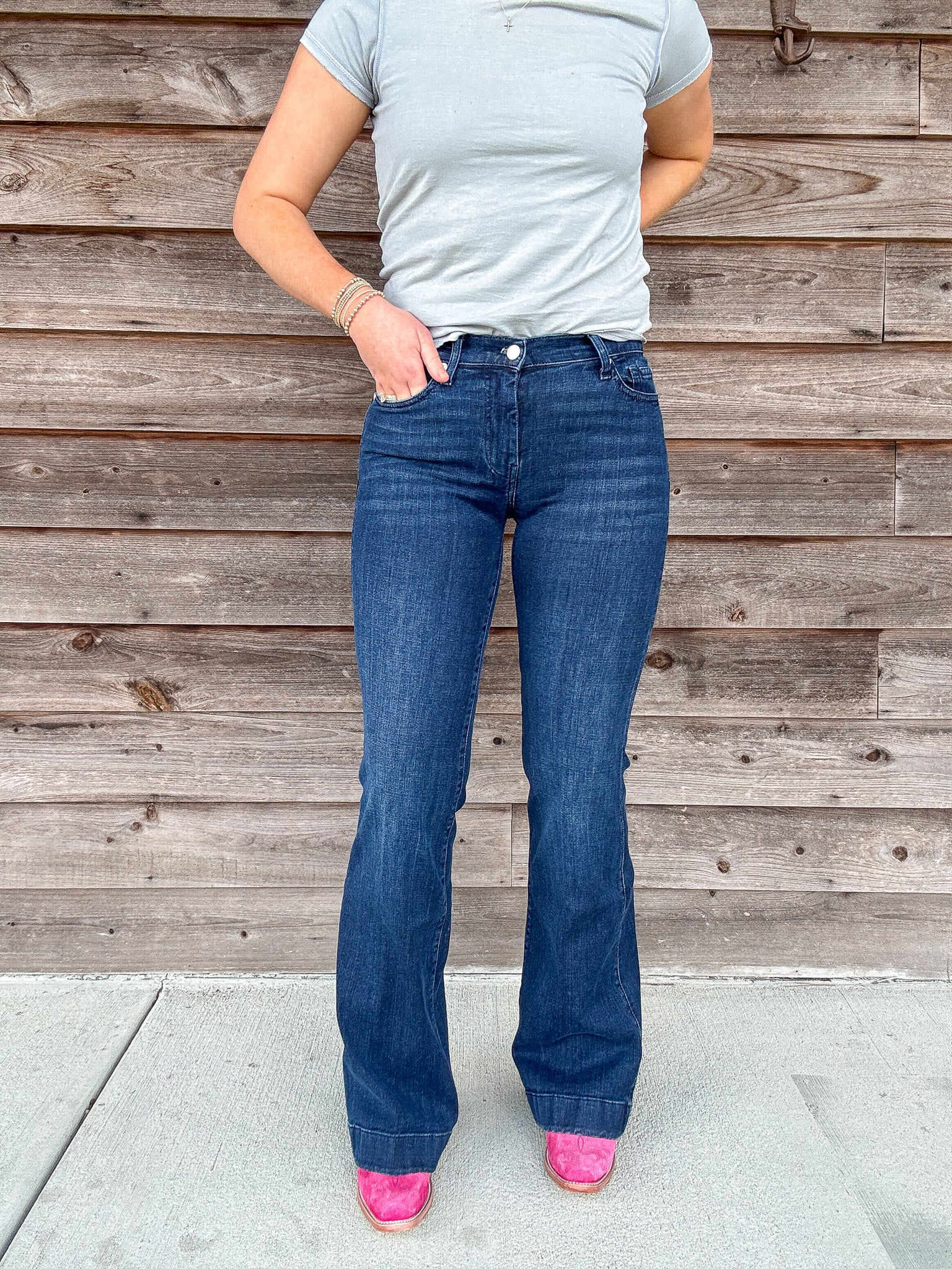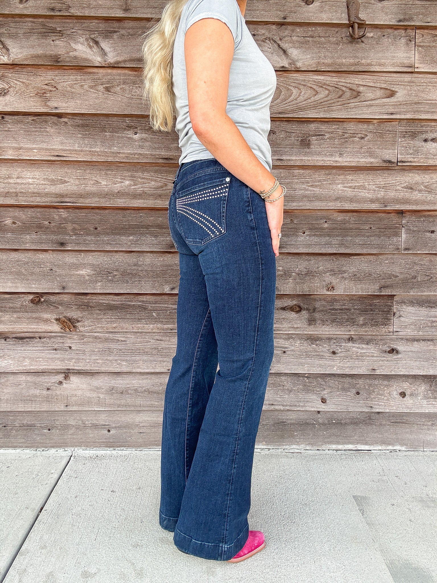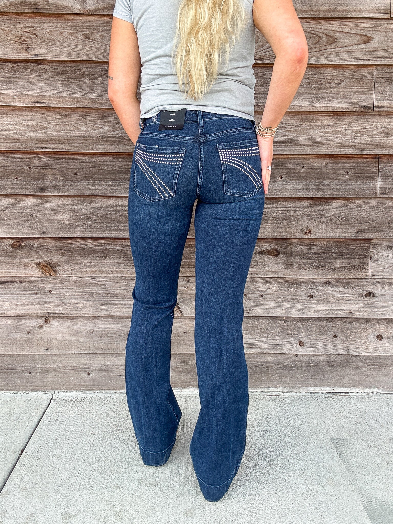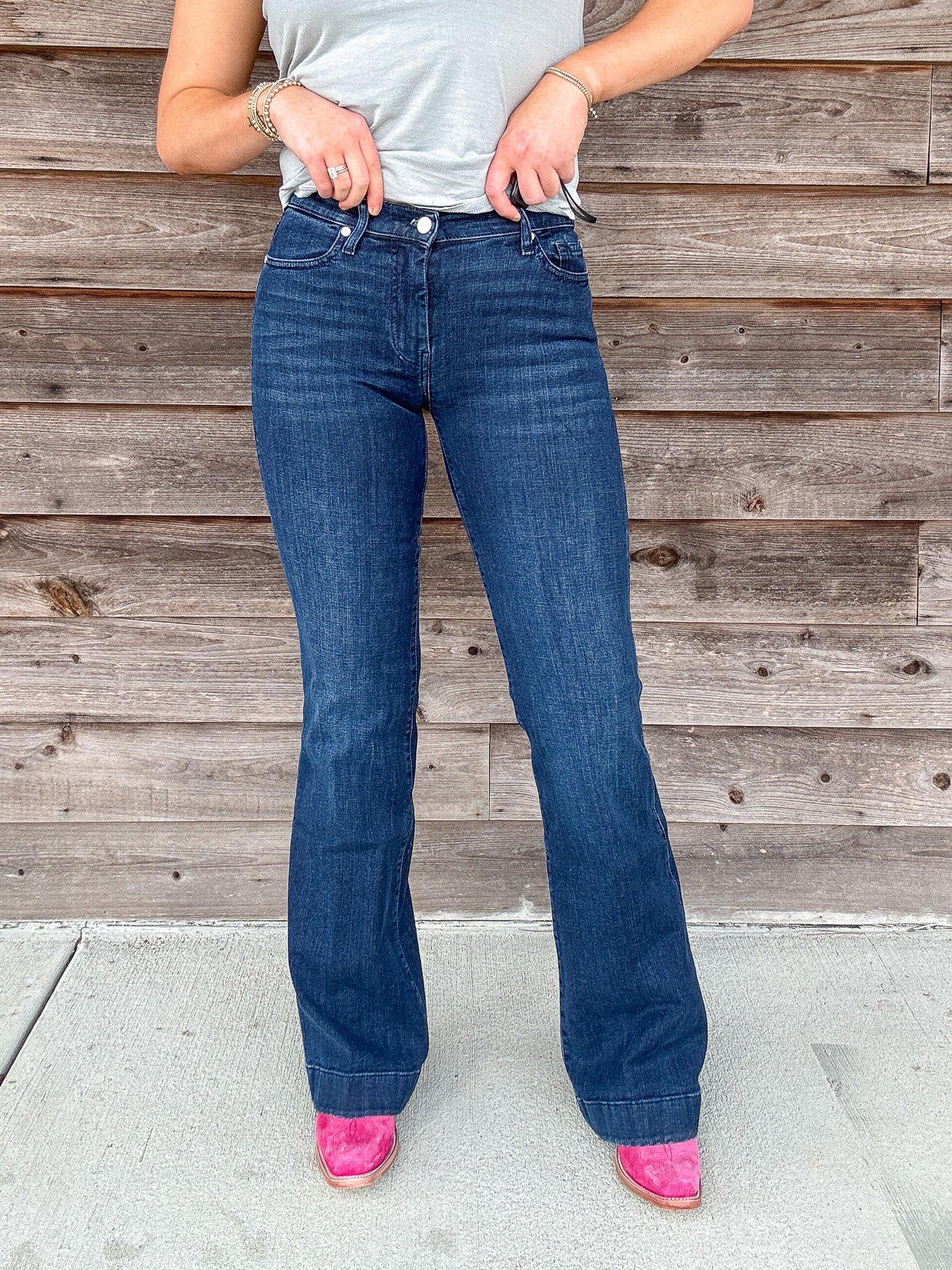 Fits like: Fitted through the hips and thighs. This mid rise denim has a wide, full-length leg and a subtle flare for a long, lean silhouette.