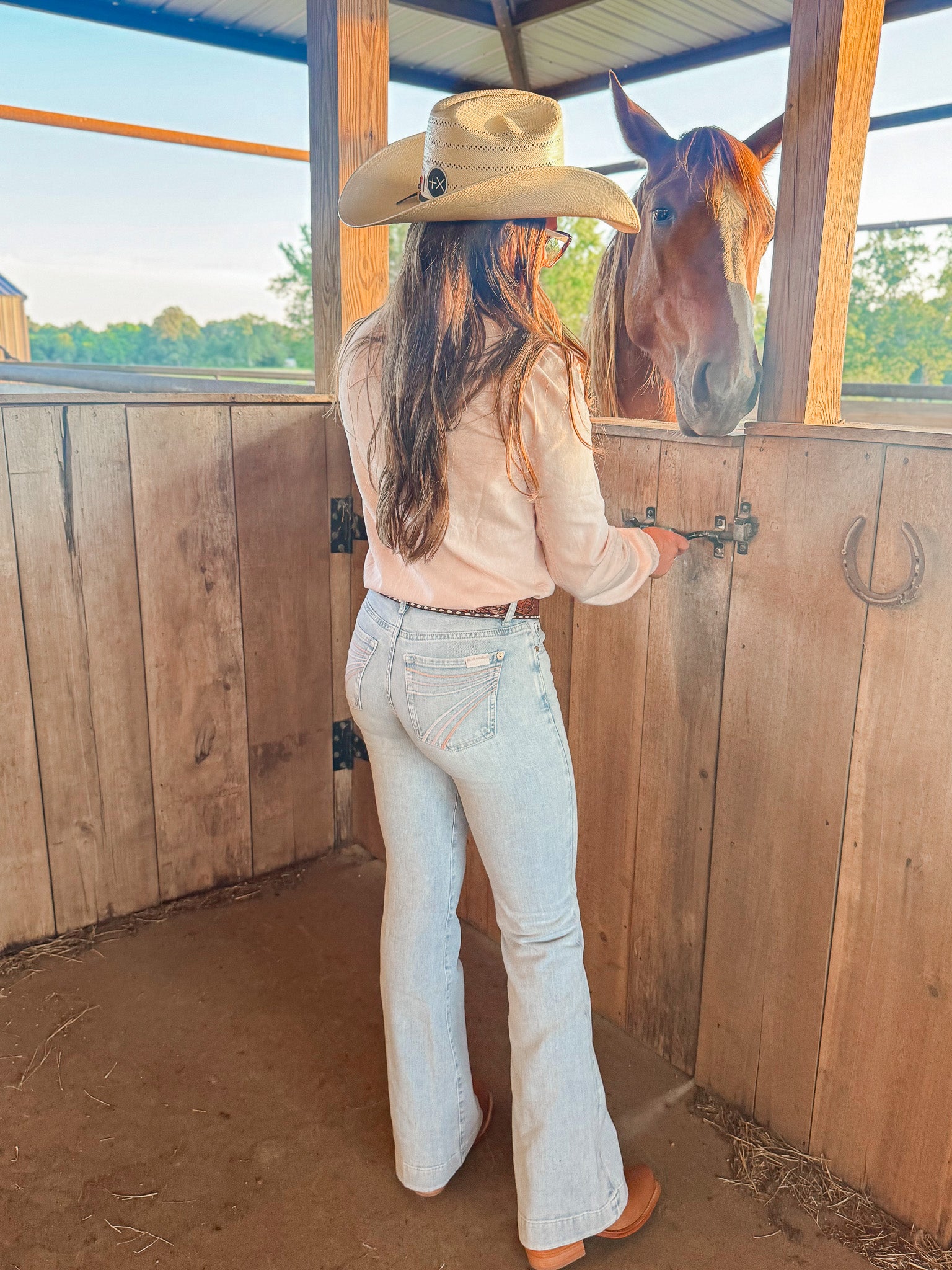- Iconic 7 back pocket embroidery in pink stitching on the back pockets for a unique, feminine touch