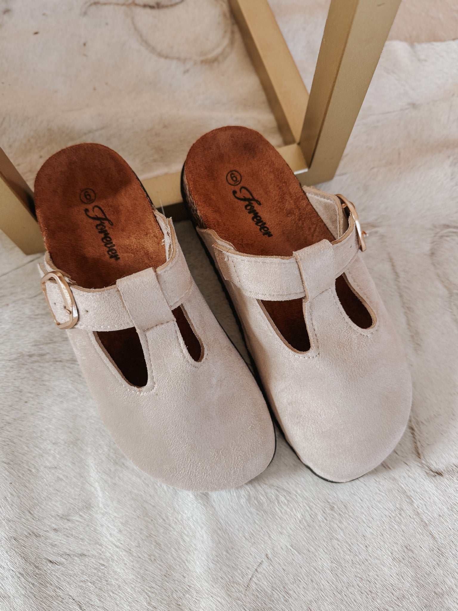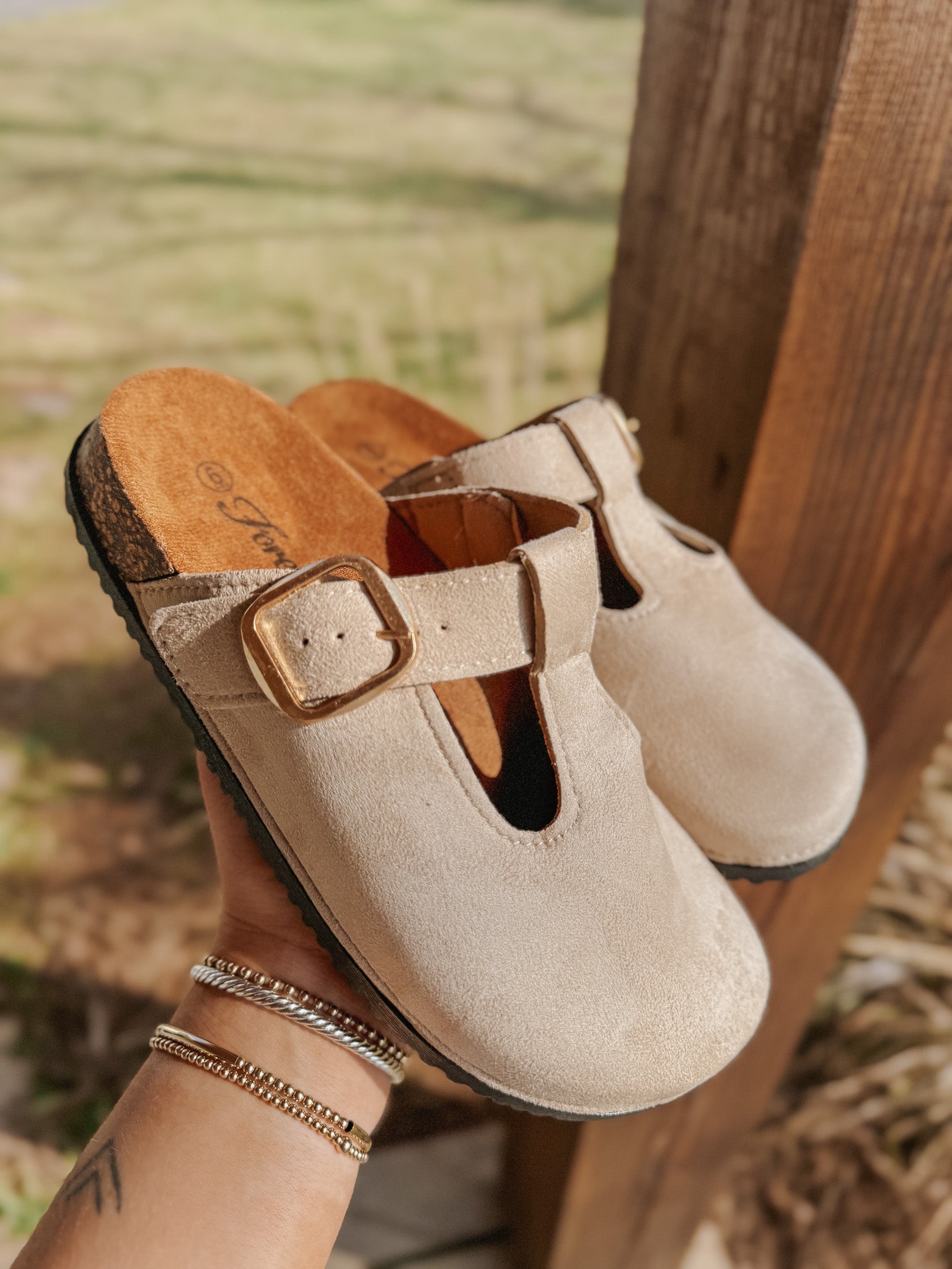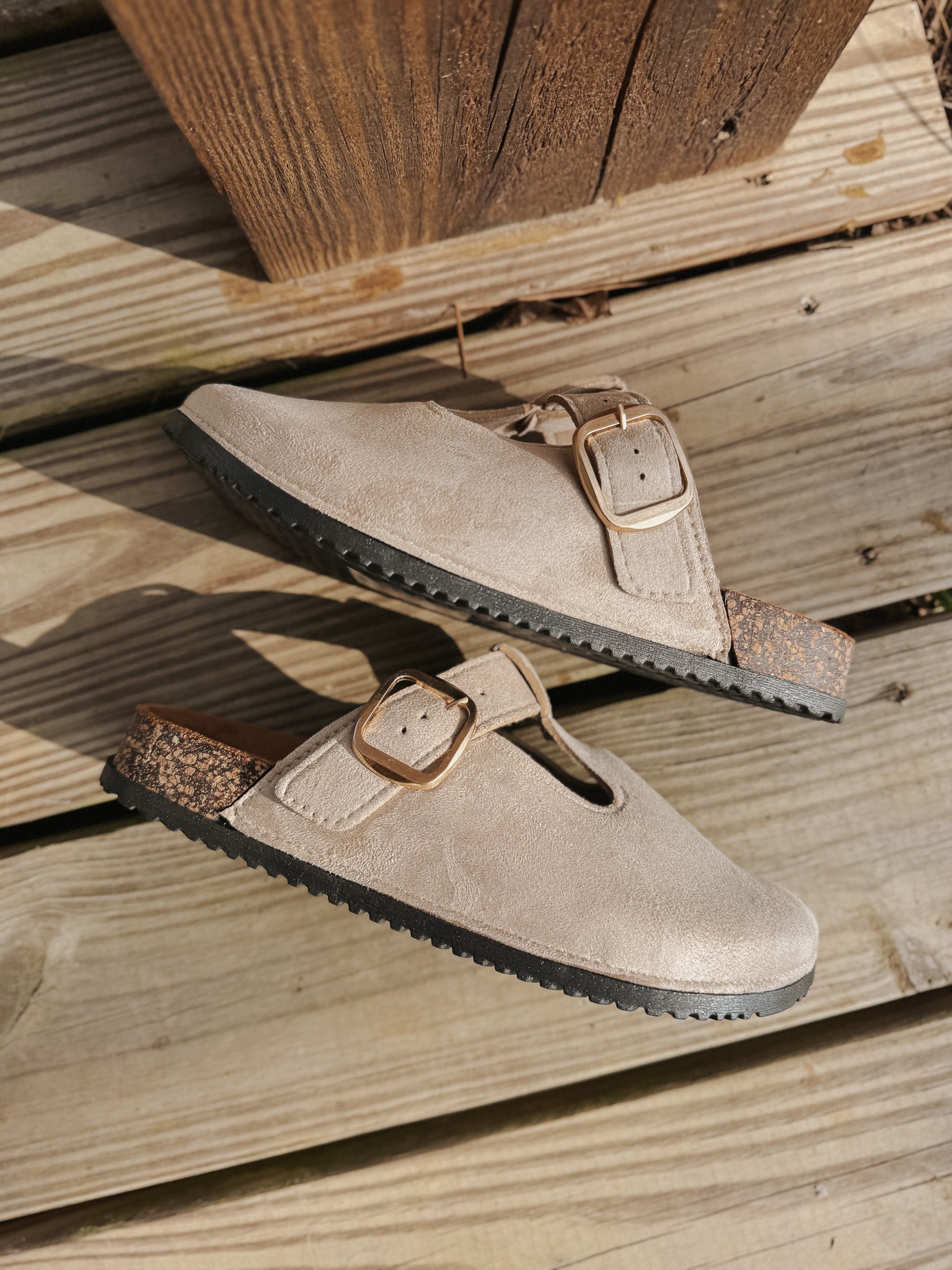 These stylish clog mules feature a neutral faux suede finish that pairs effortlessly with both casual and dressier outfits. Designed with a classic round toe and an instep strap accented by a metal buckle, they add just the right touch of on-trend flair. Easy to slip on and versatile enough for everyday wear, these clogs are a go-to for elevated, laid-back styling.