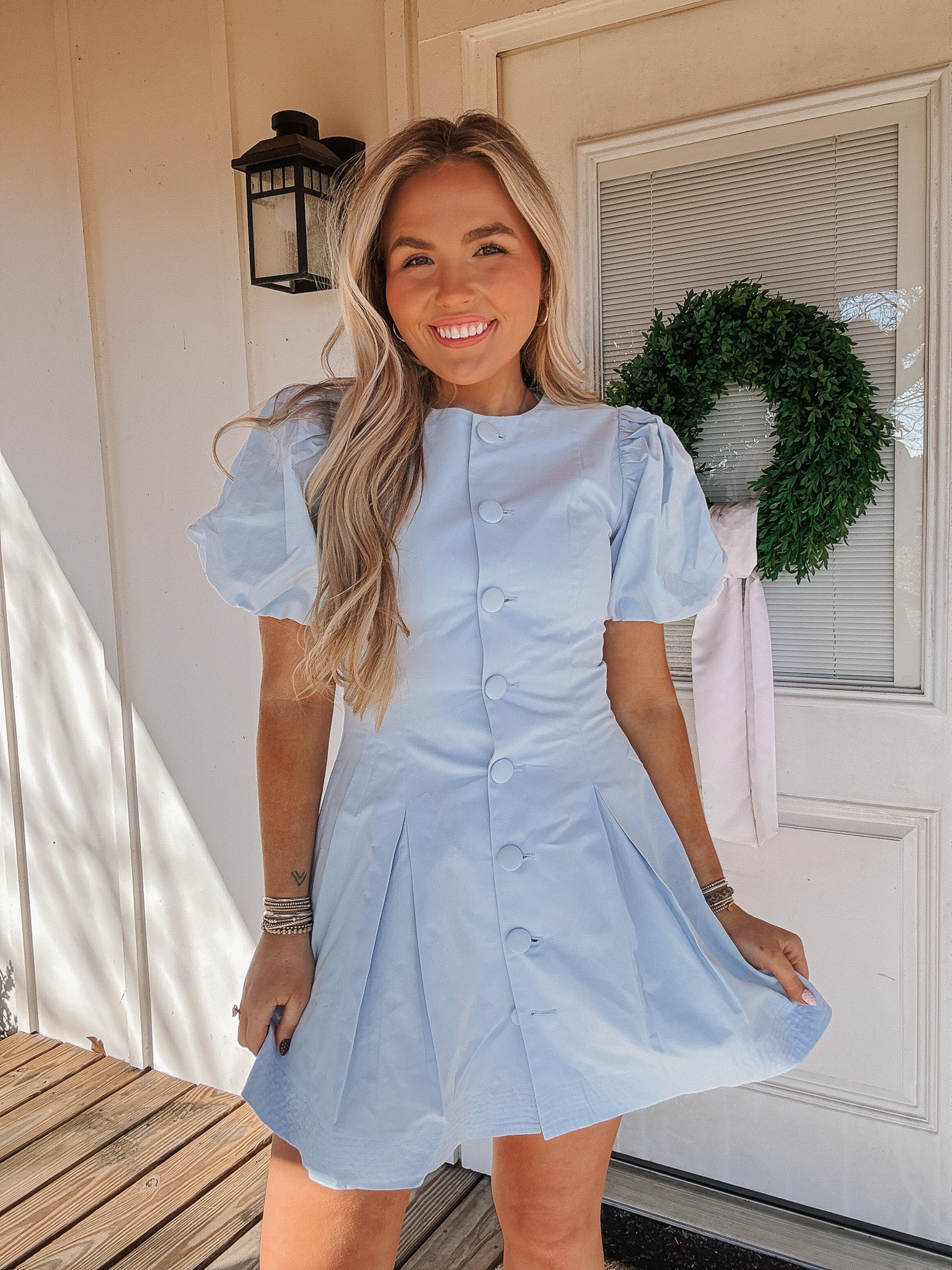 This 100% cotton button-down mini dress features voluminous puff sleeves, a classic round neckline, and fabric-covered buttons down the front for a polished, elevated look. Designed with a fitted bodice, front pleating, and an easy A-line silhouette, it’s both flattering and comfortable for all-day wear.