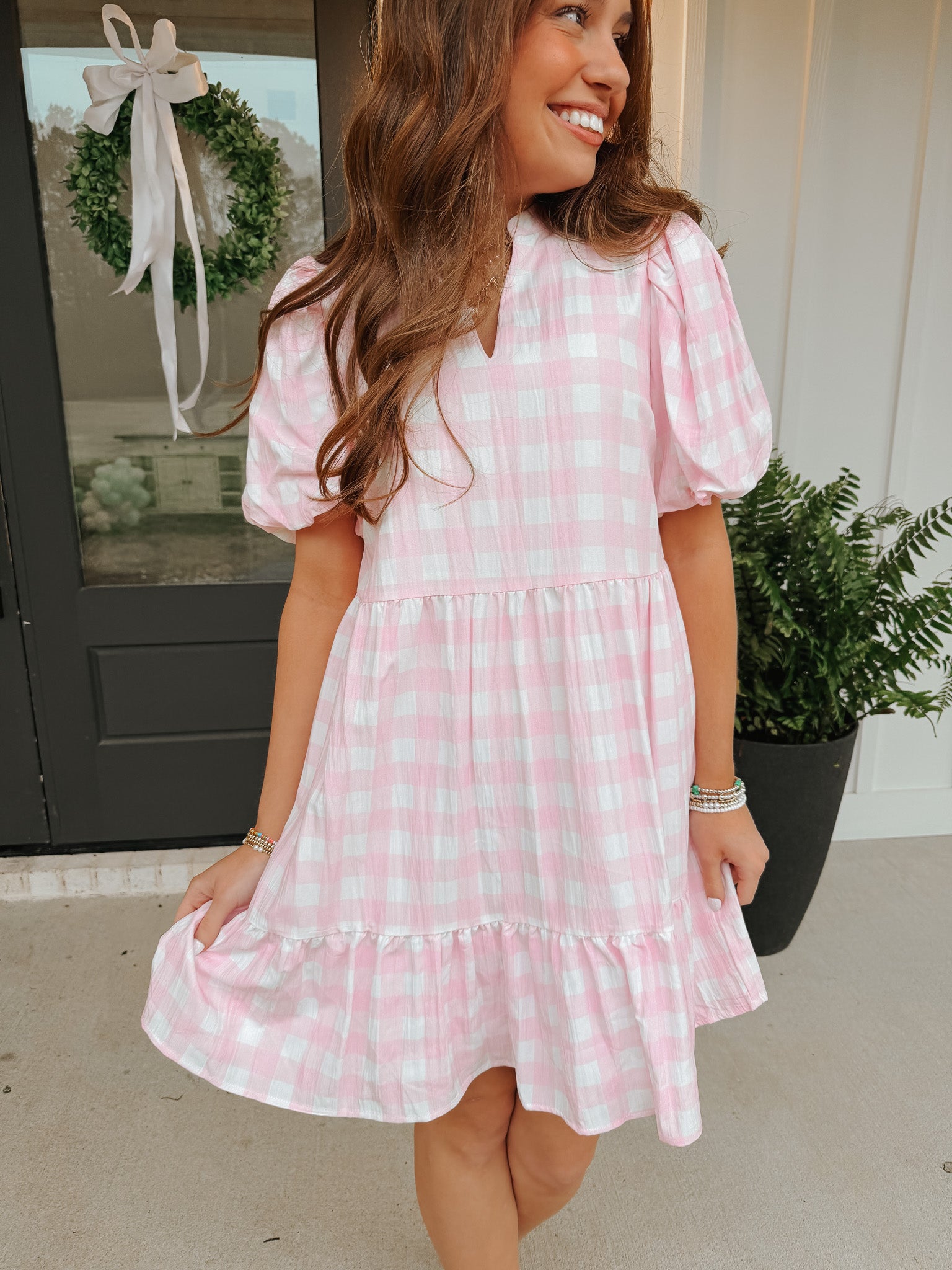Classic charm meets playful femininity in this pink gingham mini dress. Featuring soft puff sleeves and a flattering, easy fit, this dress flows into a tiered ruffle hem that adds the perfect amount of movement. The lightweight fabric makes it comfortable for all-day wear, while the timeless gingham print keeps it effortlessly cute and on-trend.