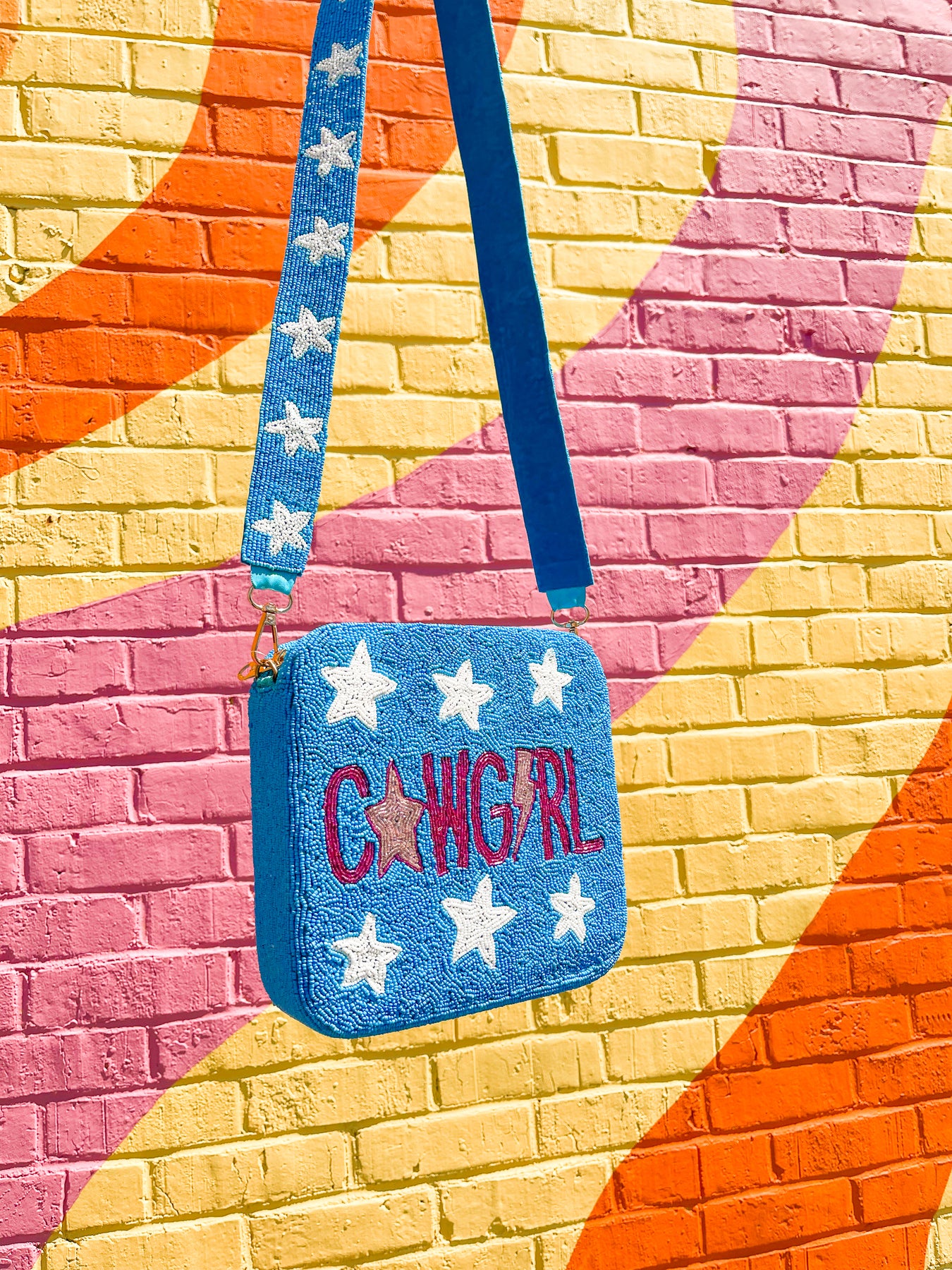 Blue COWGIRL stars beaded purse featuring white stars on the strap.