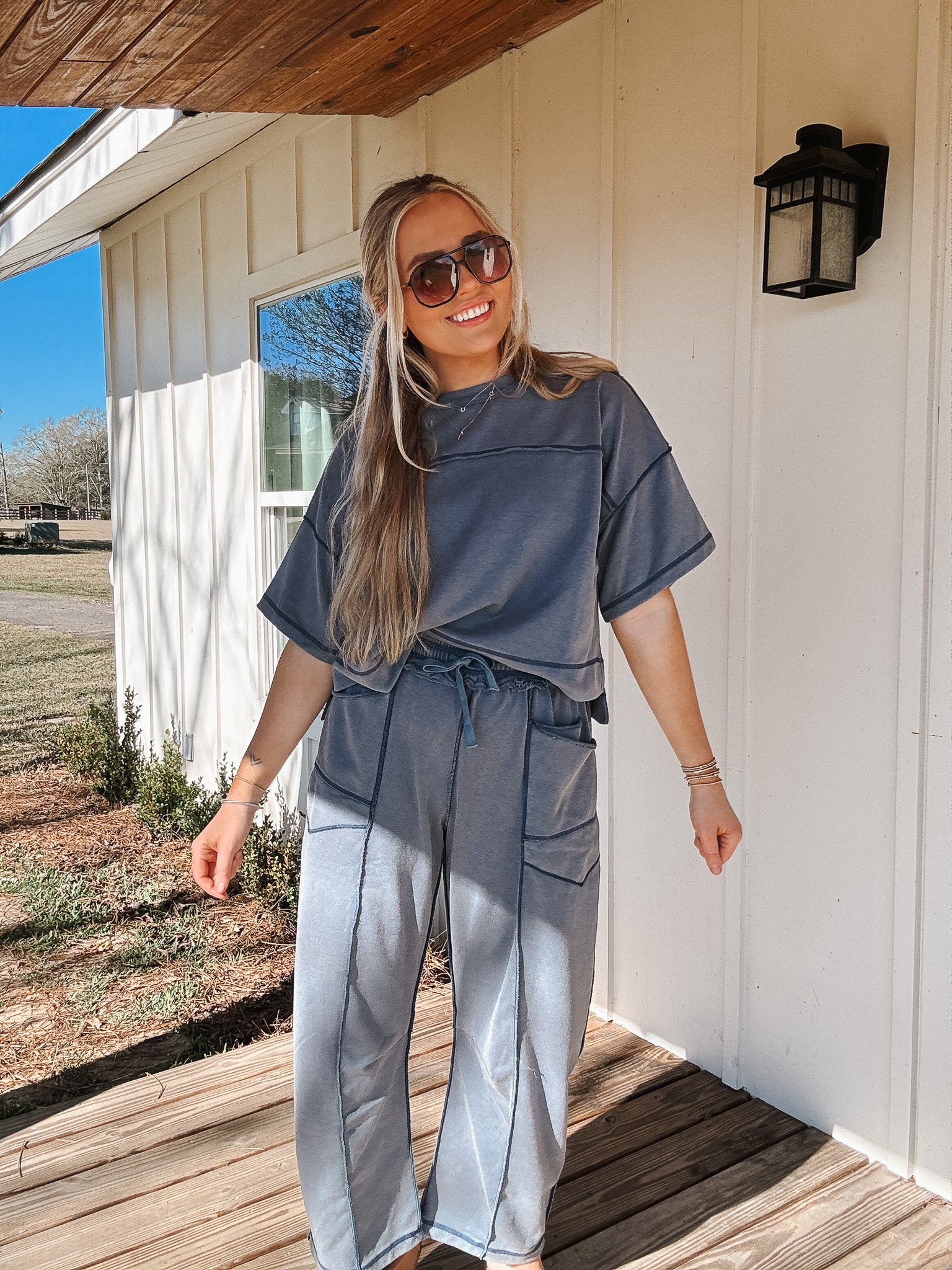 Make a bold yet comfy statement with the Simple Statement Wine Pants Set. This mineral-washed duo pairs a relaxed boxy top with barrel pants featuring playful exposed seams and oversized cargo pockets for extra flair and function. The elastic drawstring waist keeps things easygoing, making it perfect for lounging or stepping out in style. With its soft, worn-in finish, this set effortlessly blends cozy vibes with boutique edge—your new go-to for mixing, matching, and turning heads.