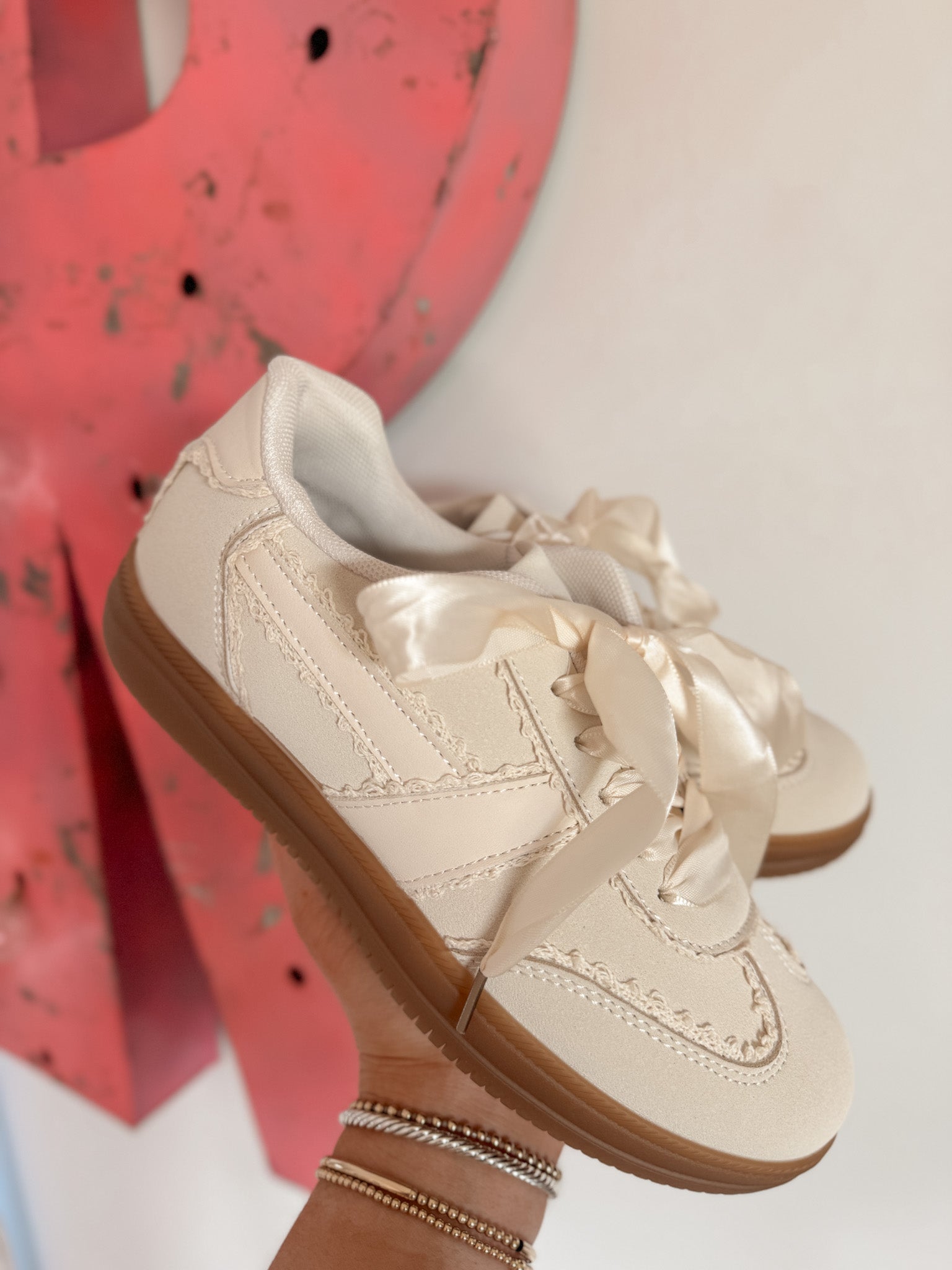 Light cream sneakers dressed with satin ribbon laces and dainty lace accents. A fun yet versatile pick that adds a hint of elegance to everyday steps—made for women who love standout style with a gentle, girly touch.