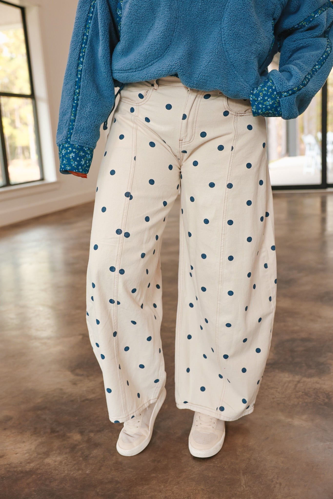 Polka Dot Printed Wide Denim Pants Rock that effortless, relaxed vibe with these cream and navy polka dot wide-leg denims. Cut in a barrel jean silhouette, they've got that perfect slouchy fit that feels as good as it looks—roomy through the hip and thigh with a tapered ankle for balance. The playful print adds personality to your everyday rotation!