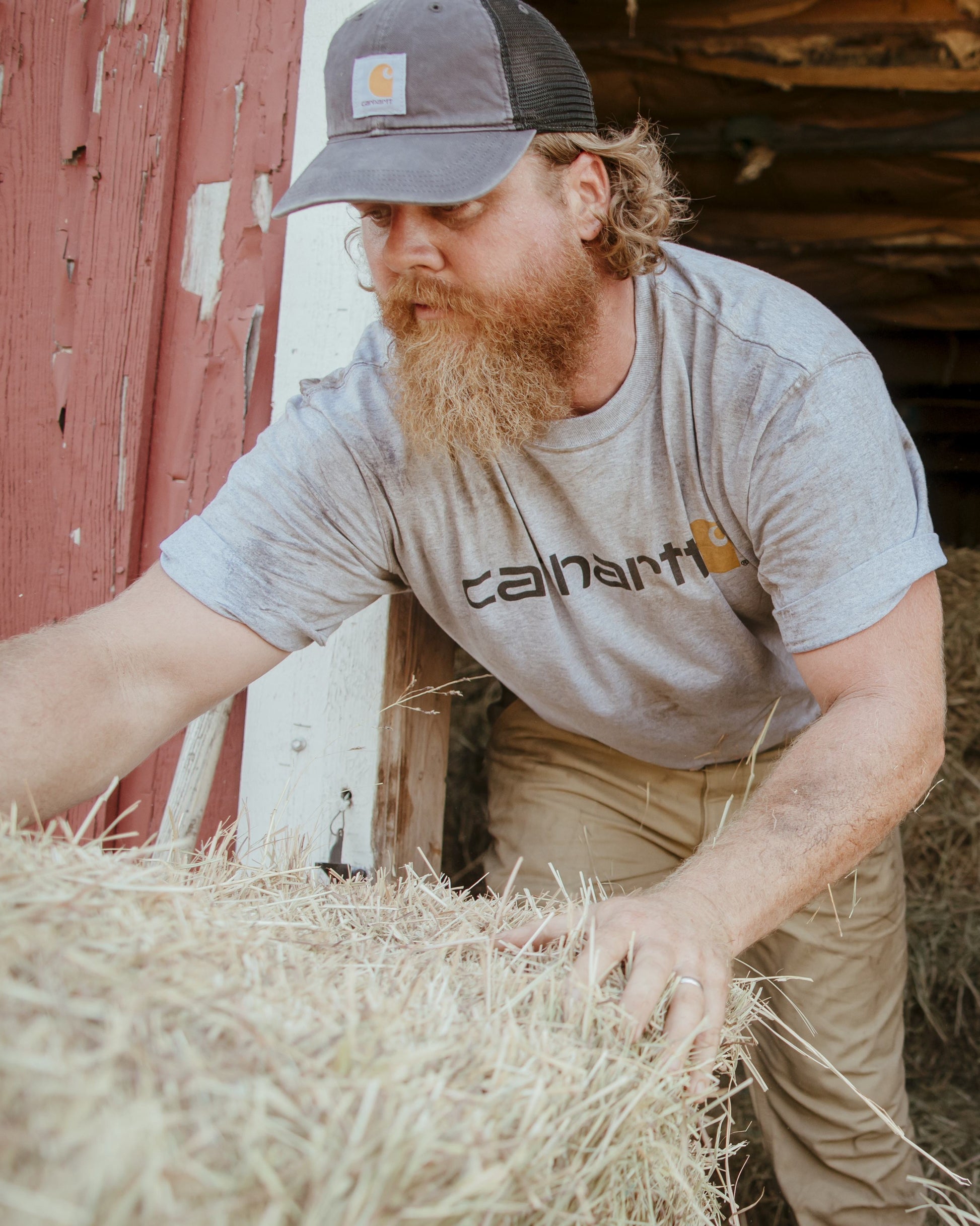 Carhartt's short-sleeve logo t-shirt is designed for work. Made of 6.75-ounce, 100% cotton jersey knit, it features a rib-knit crewneck, side-seamed construction to minimize twisting and a tagless neck label. The Carhartt logo is printed on the chest and back. Heather Gray fiber content is 90% cotton/10% polyester. 6.75-ounce, 100% cotton jersey knit, midweight Side-seamed construction to minimize twisting Carhartt logo on front and back