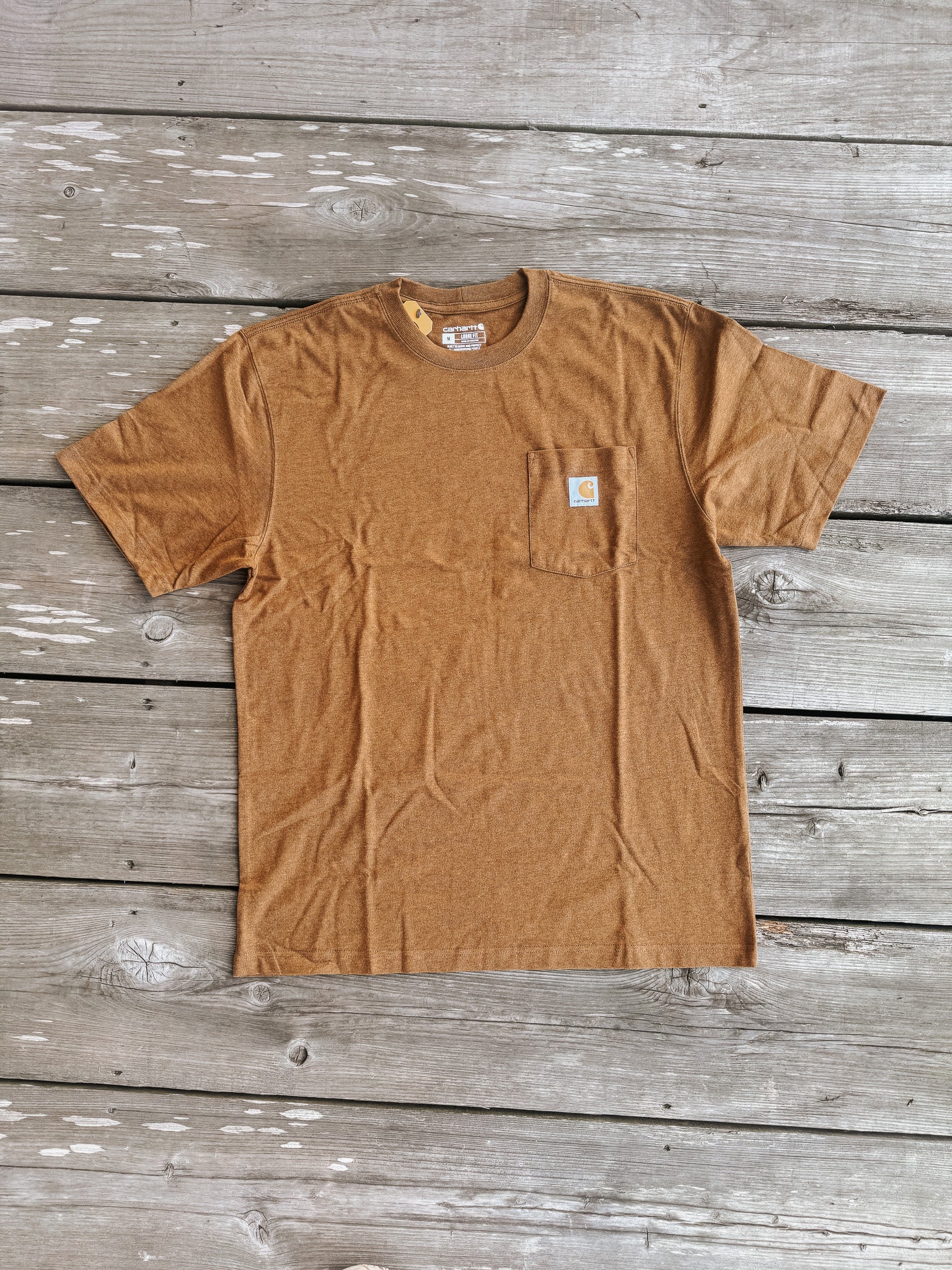 A work-wear staple, this men's pocket t-shirt is equal parts durable and comfortable. It has an original fit, Carhartt's roomiest cut. The heavyweight fabric only gets softer with time. Rib-knit crew-neck holds its shape throughout the day. Side-seam construction minimizes twisting. Left-chest pocket with sewn-on Carhartt patch. Tag-less neck label for a smooth feel.