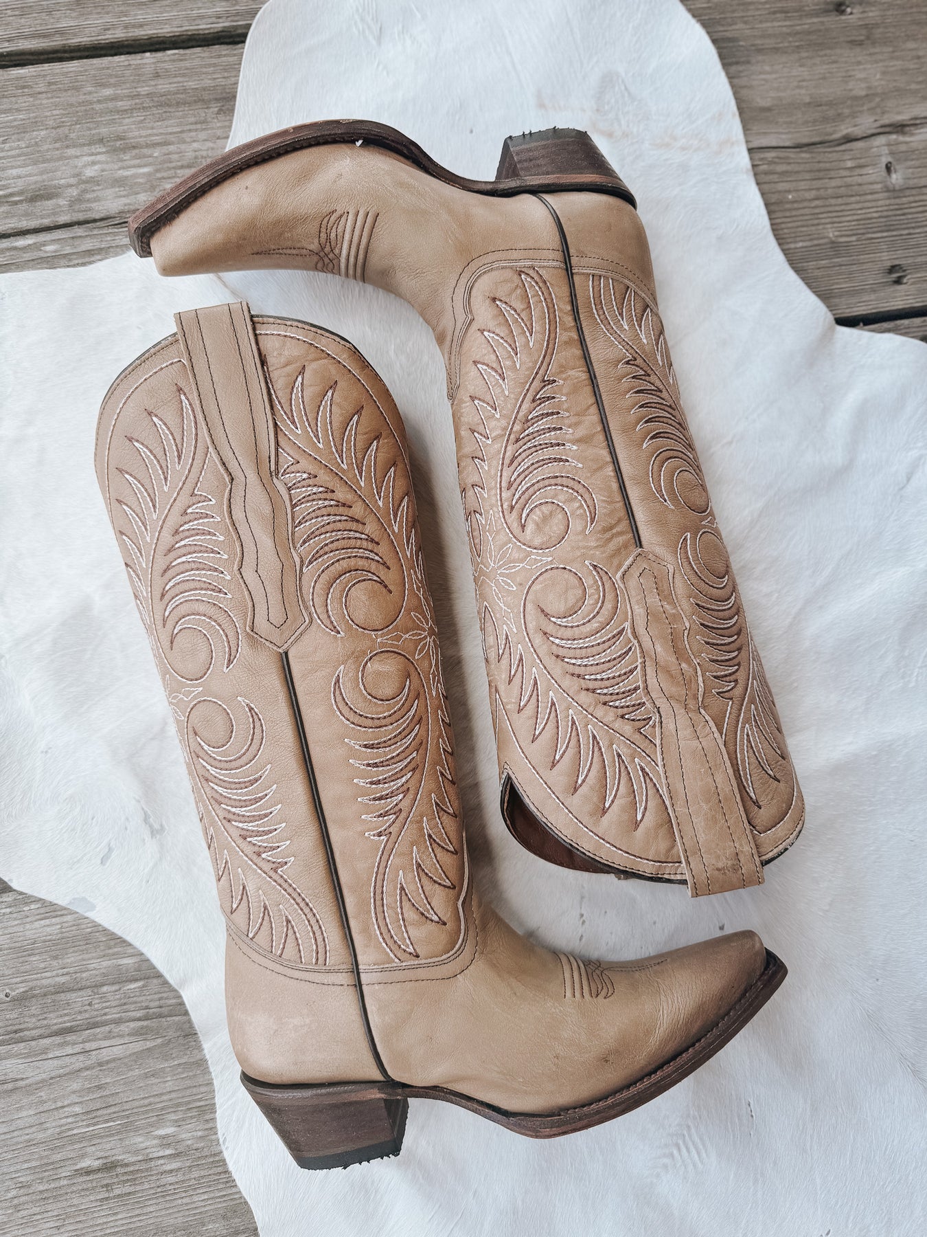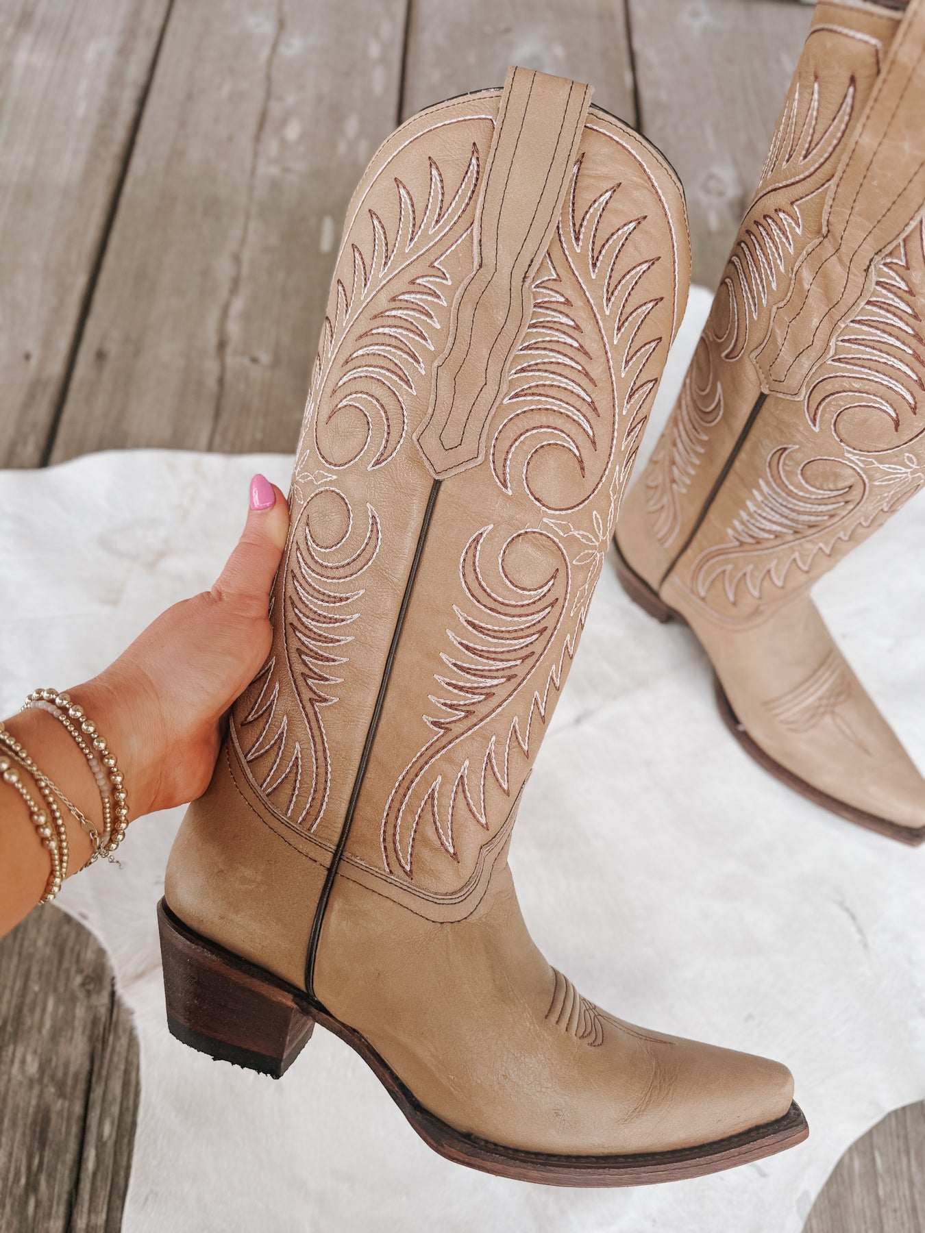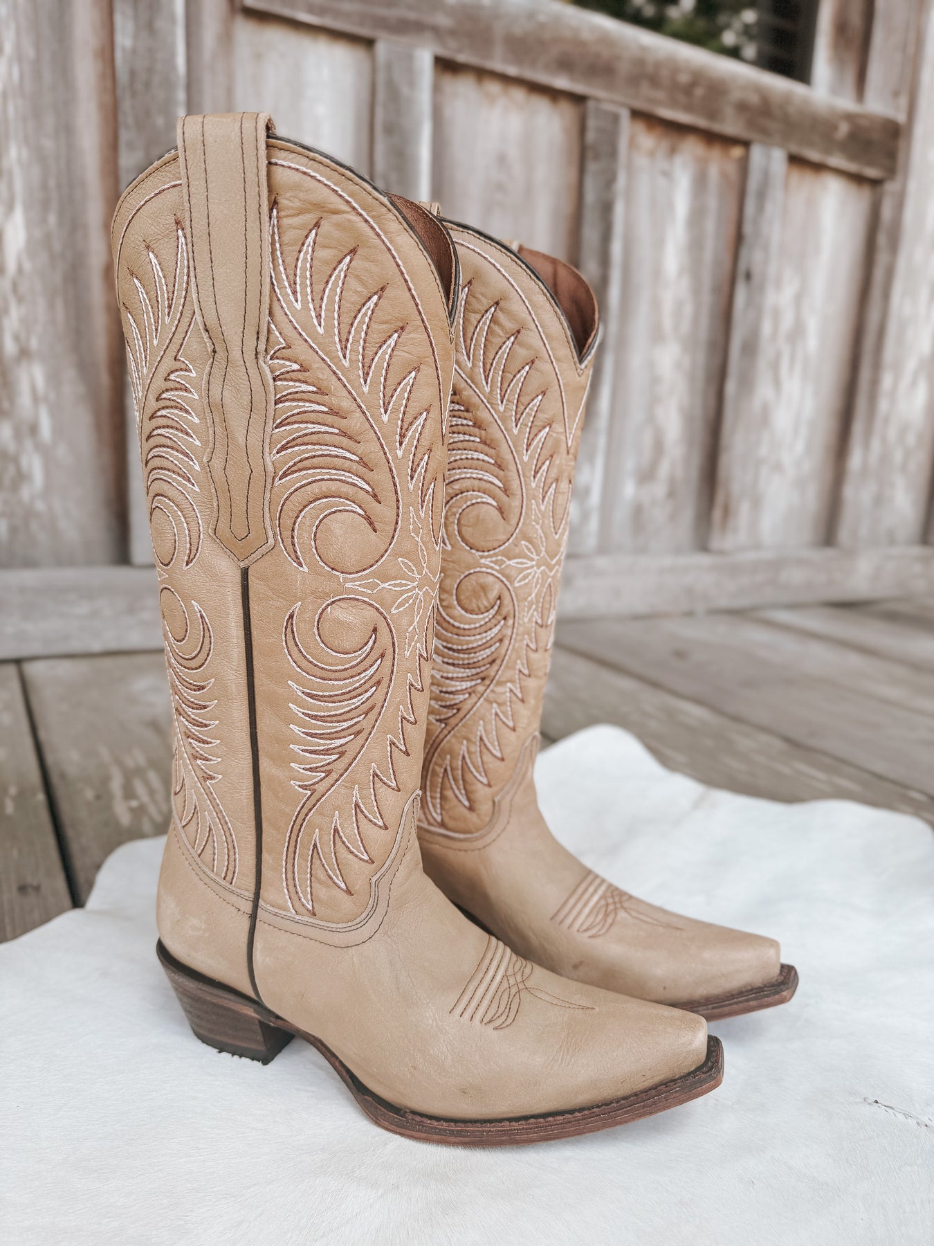 These elegant Circle G by Corral women's boots boast a gorgeous distressed sand hue and intricate embroidery, making them a must-have for any fashionable wardrobe!