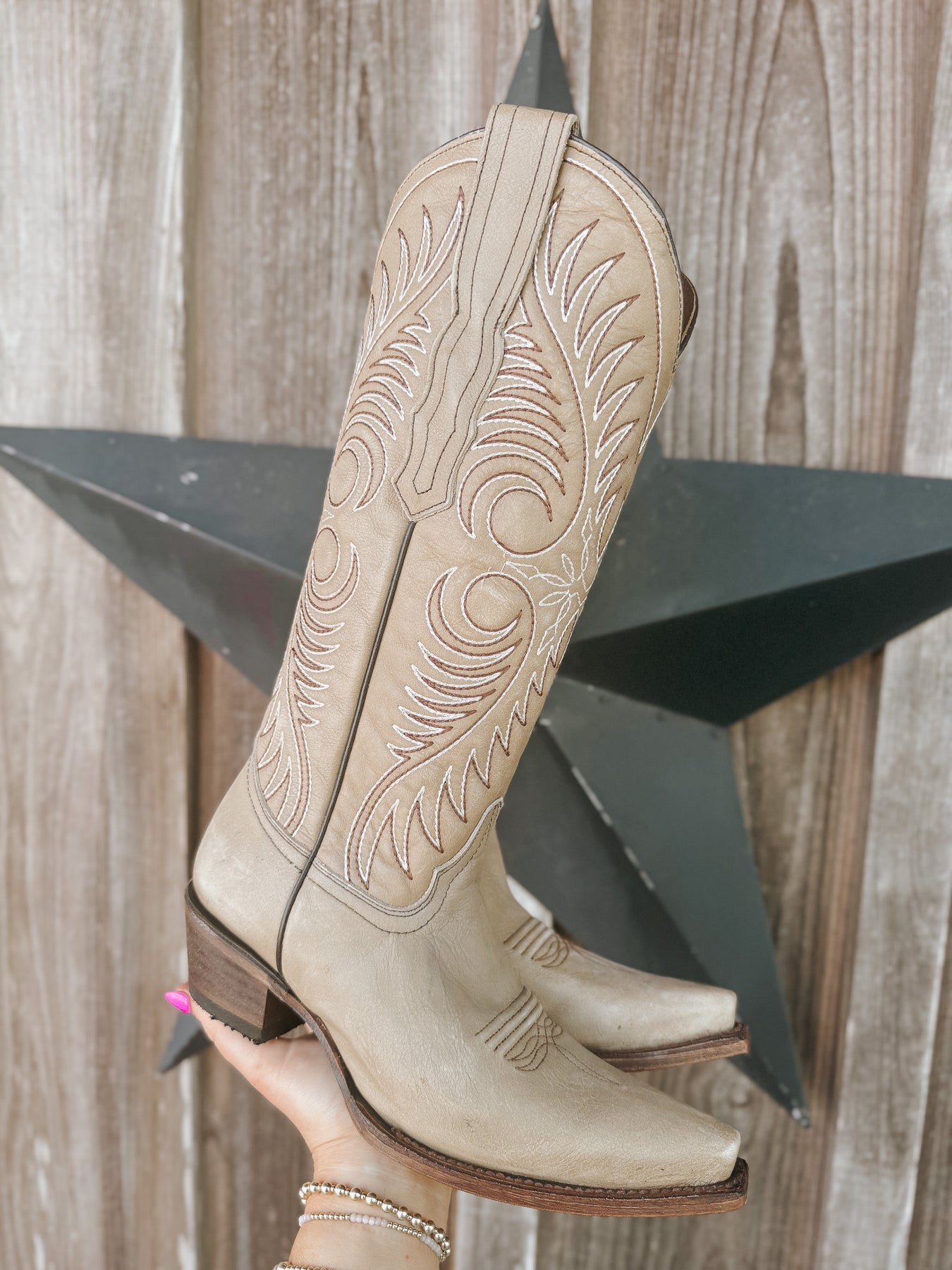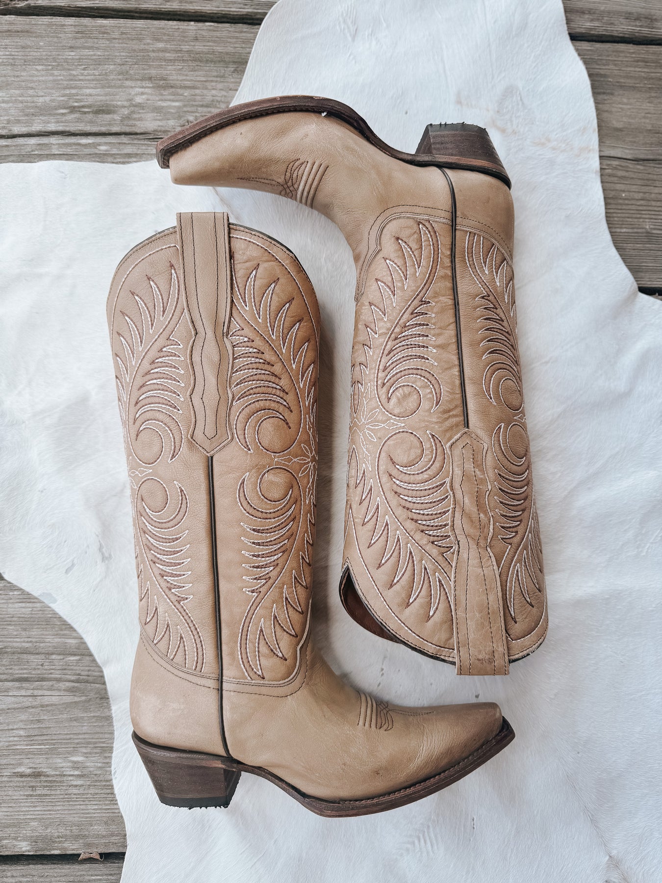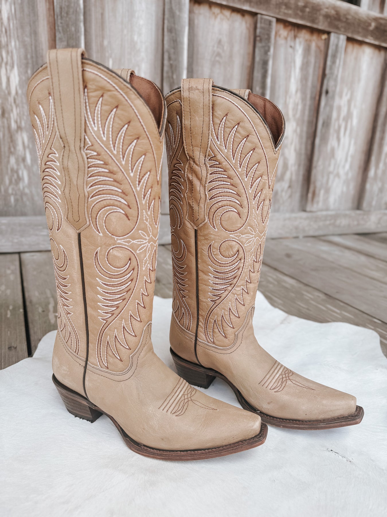 These elegant Circle G by Corral women's boots boast a gorgeous distressed sand hue and intricate embroidery, making them a must-have for any fashionable wardrobe!