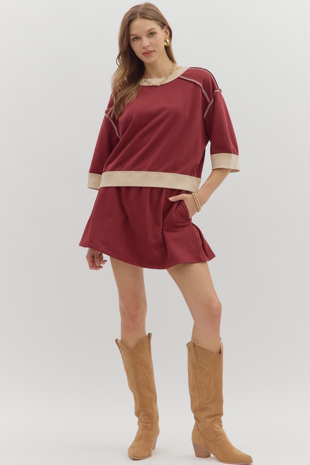 Stay effortlessly stylish with the Casual Charm Skort in Burgundy. This playful skort features a solid knit with an adjustable elasticated waistband for a perfect fit. The pleated back adds a flirty twist, while side pockets keep your essentials close. Lightweight and lined, it’s comfortable and never sheer—perfect for all-day fun.