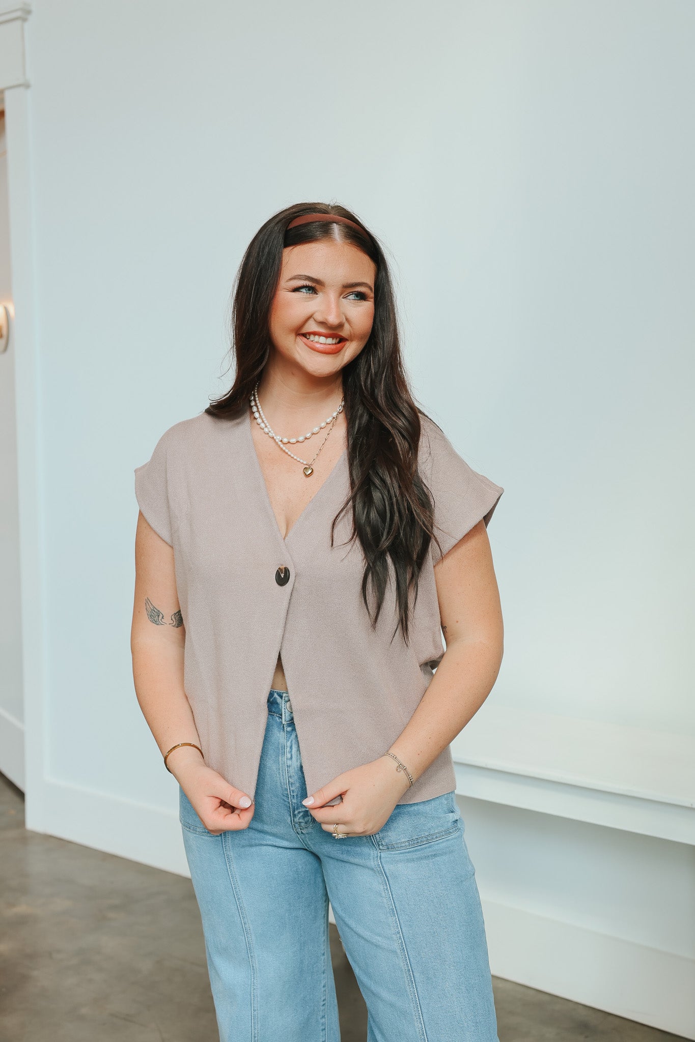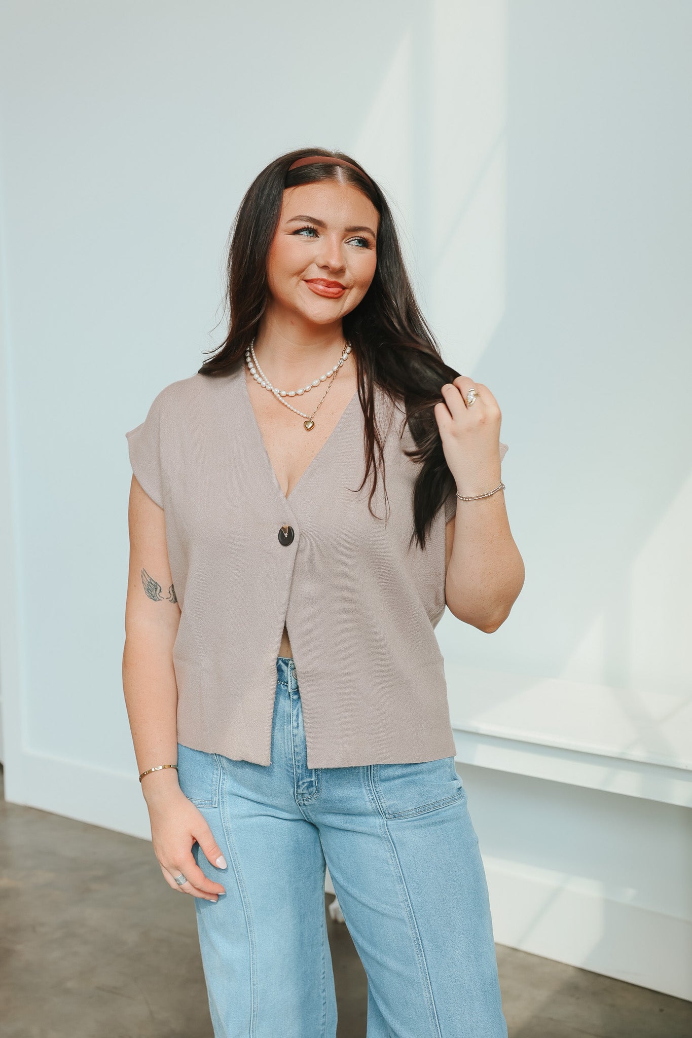 Make a statement with the Bold Moves Light Mocha Vest, your new go-to oversized sweater vest. This cozy, single-button layer adds a playful twist to any outfit, perfect for mixing and matching with your favorite shirts or dresses. Its light mocha hue brings warmth without overwhelming your look, while the relaxed fit keeps comfort front and center. Ready to turn heads and stay snug? This vest has your back.