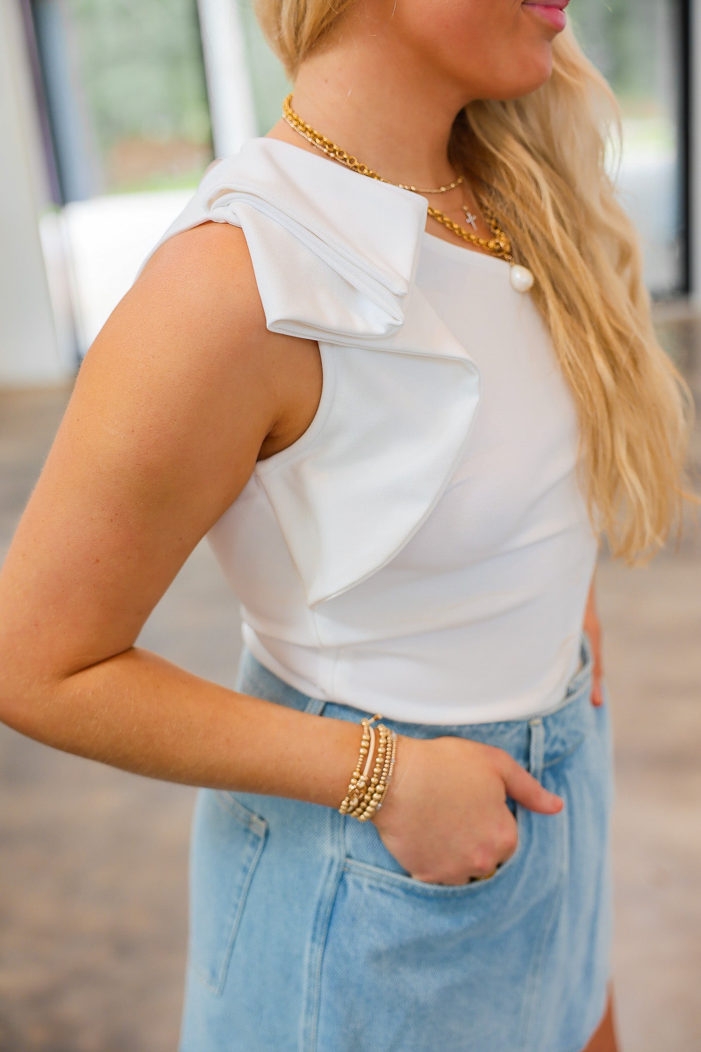 Elevate your look with the Downtown Views Off White Top—a sleeveless heavy knit design featuring an eye-catching asymmetrical neck and playful ruffle detail. This unique silhouette adds flair to any outfit while keeping you cozy and stylish all day long.