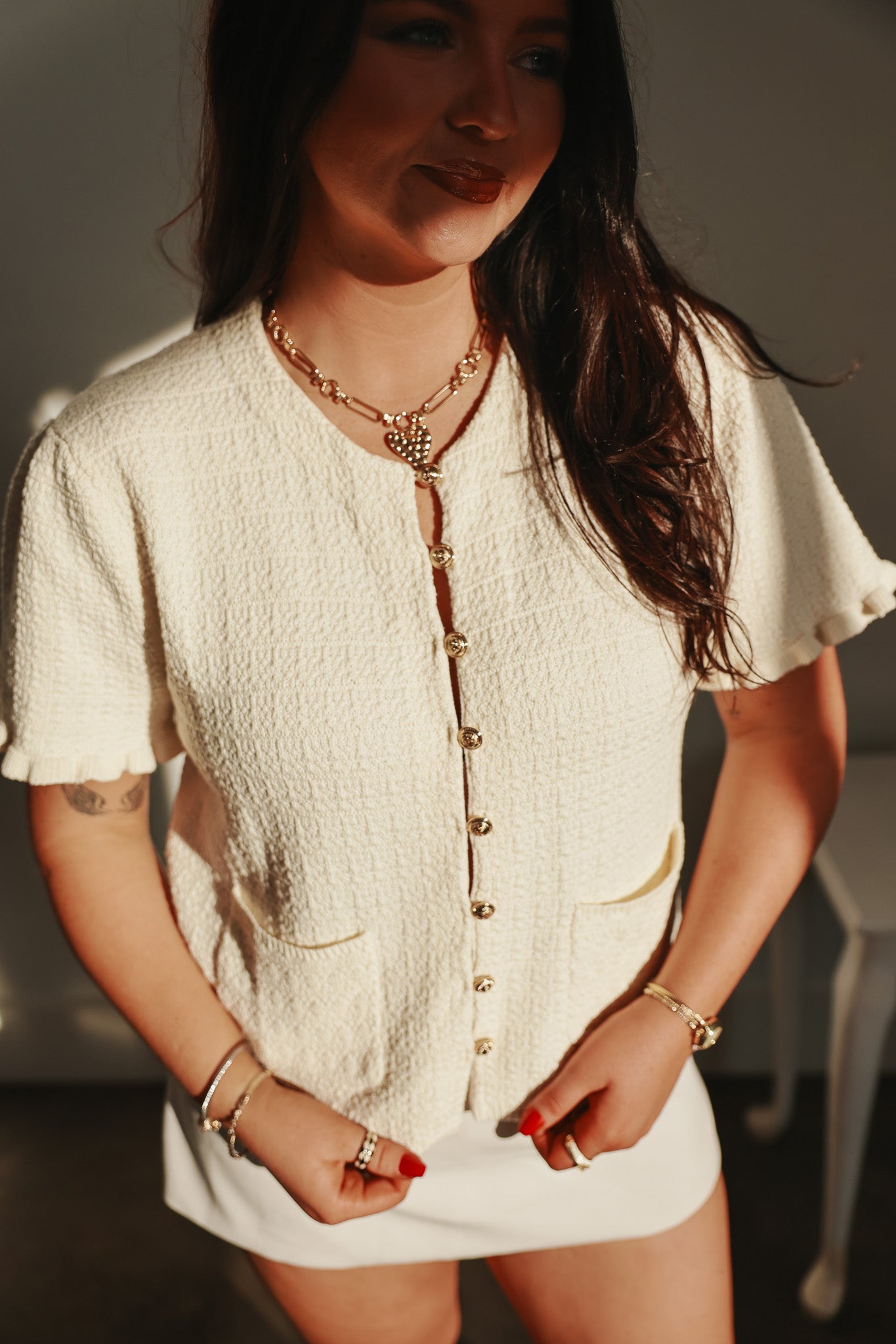 Elevate your everyday style with this ruffled short-sleeve top that's super versatile! Rock it fully buttoned, leave it open for an effortlessly chic layer, or button just the top. Front pockets for extra detailing, and gold buttons that add a touch of upscale charm. Whether you're dressing up or keeping it casual, this top adapts to your wardrobe.