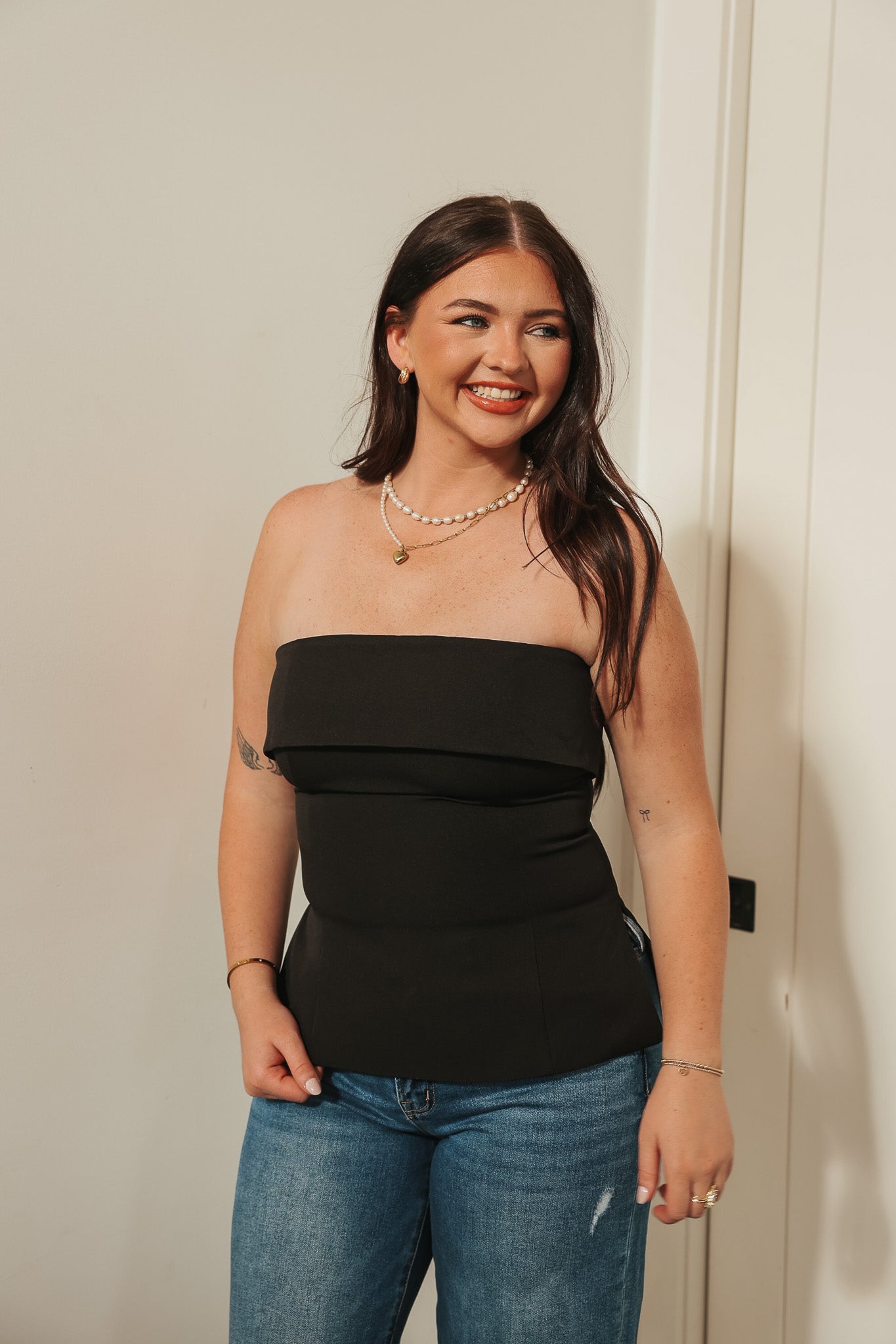 Turn heads with the City Nights Strapless Black Top, your new go-to for nights out. This sleek, strapless design hugs your silhouette, offering a chic and flirty look that’s perfect for dancing under the city lights or simply owning your style. Easy to pair and irresistibly stylish, it brings effortless confidence to any outfit.
