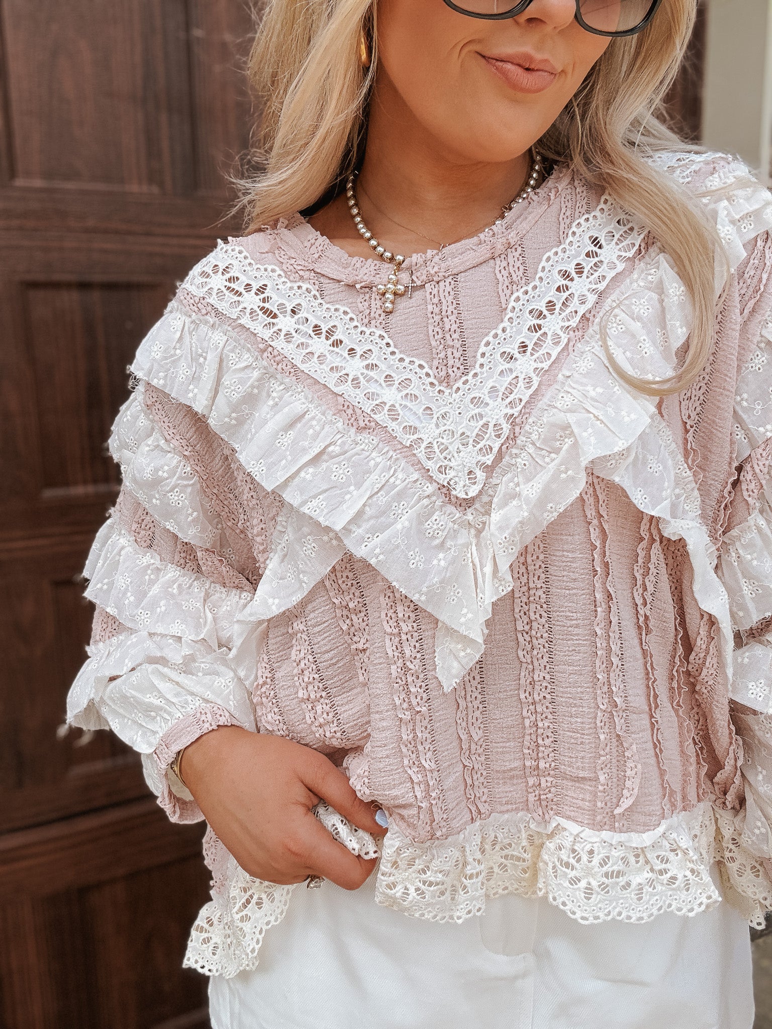 Intricately detailed lace blouse crafted with layered ruffle accents and delicate eyelet embroidery throughout. Designed with a relaxed silhouette, round neckline, and softly structured long sleeves. The breathable knit fabric offers comfortable wear while maintaining an elevated, romantic look. A statement blouse that brings depth and character to everyday styling, ideal for pairing matching bottom or other layered ensembles.